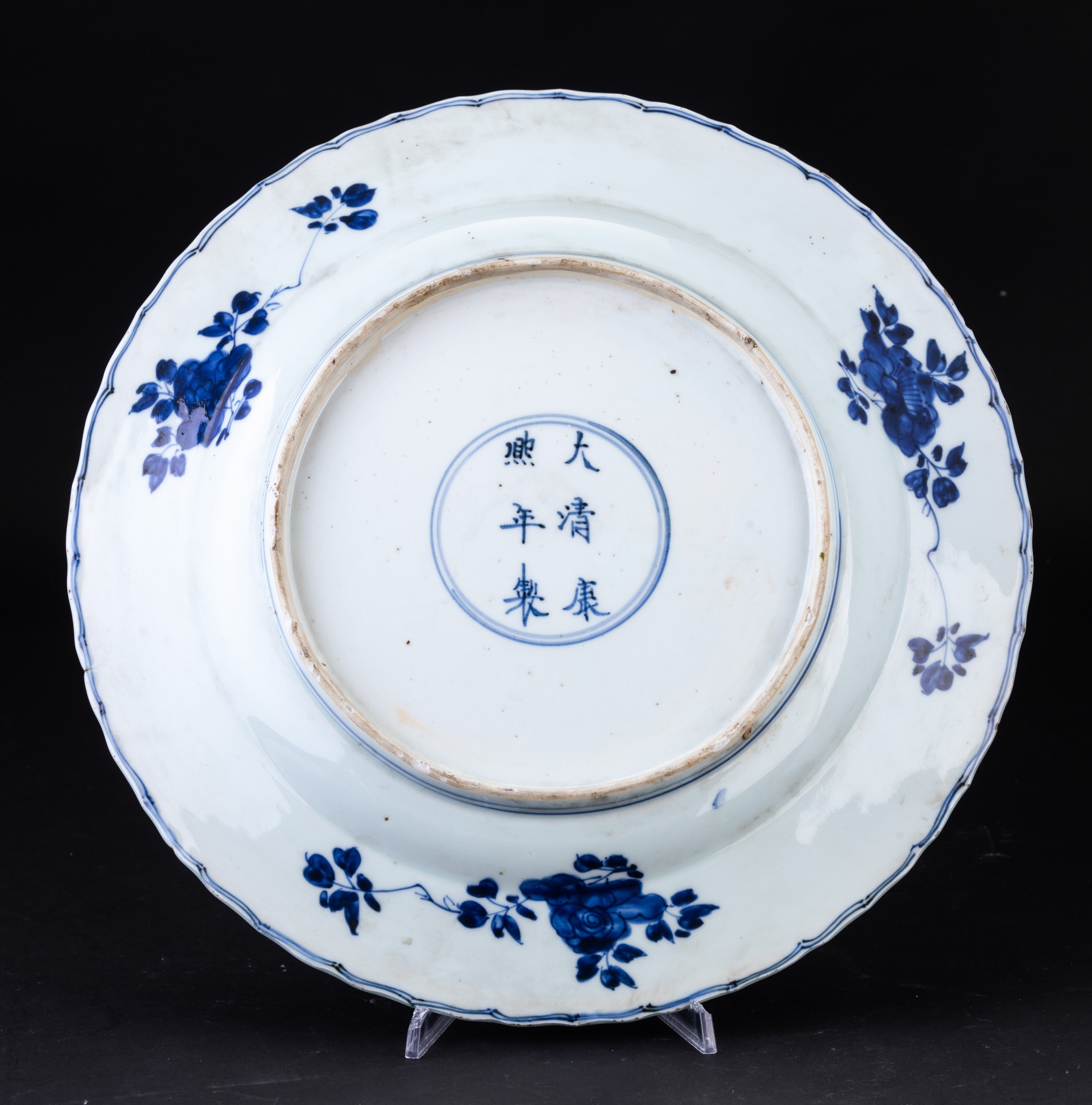 Due piatti in porcellana bianca e blu con decori floreali e soggetti naturalistici, [..]