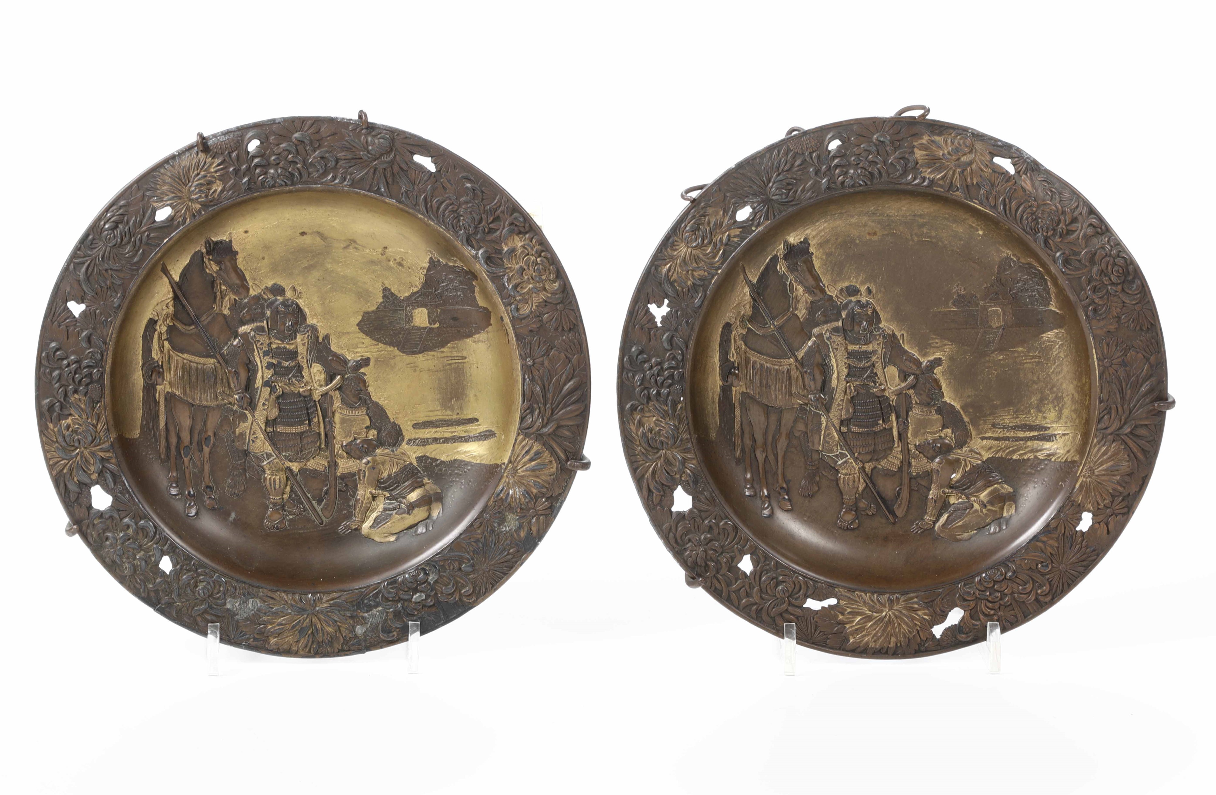 Due piatti in rame sbalzato raffiguranti guerrieri, Giappone, XX secolo