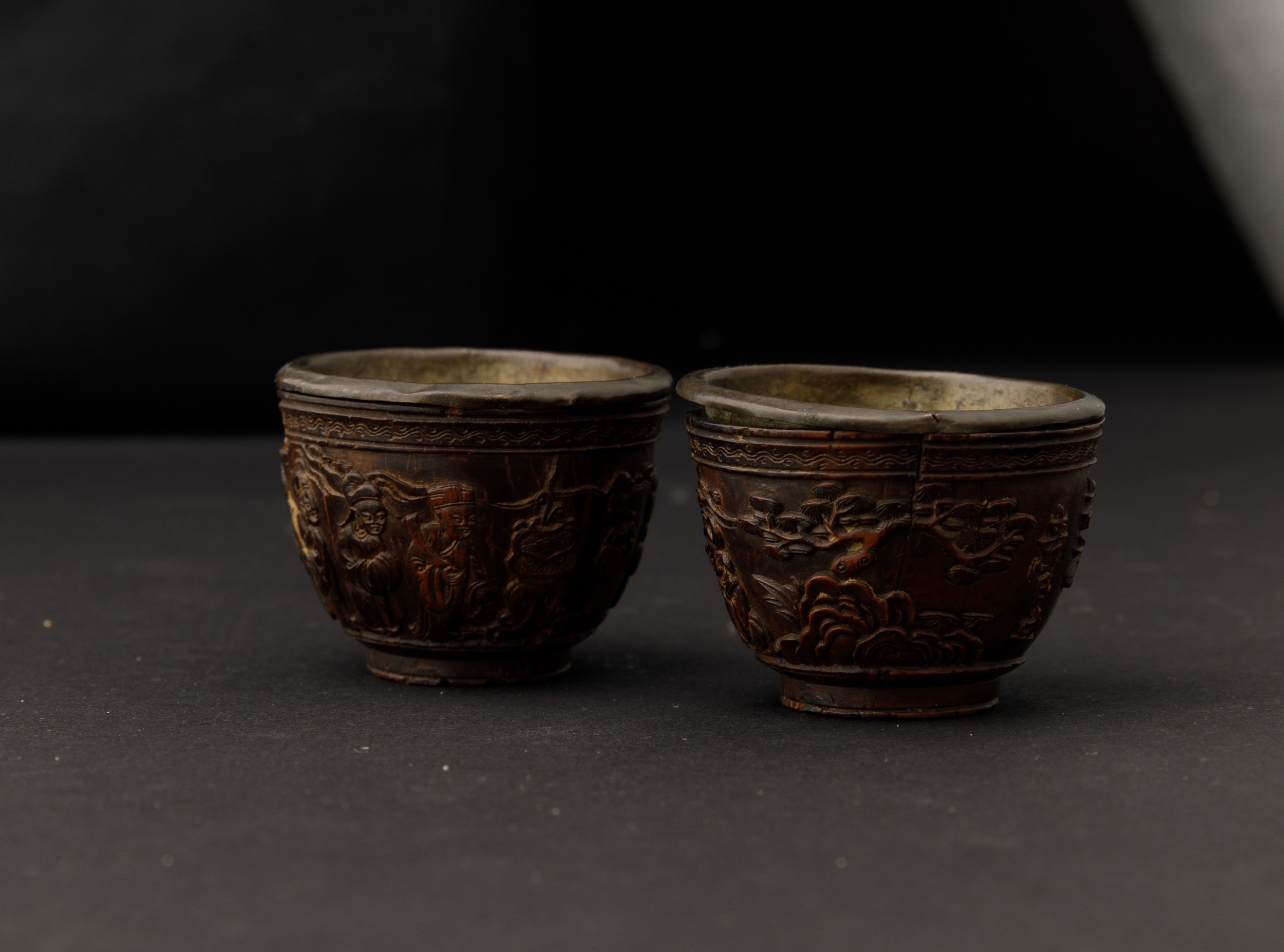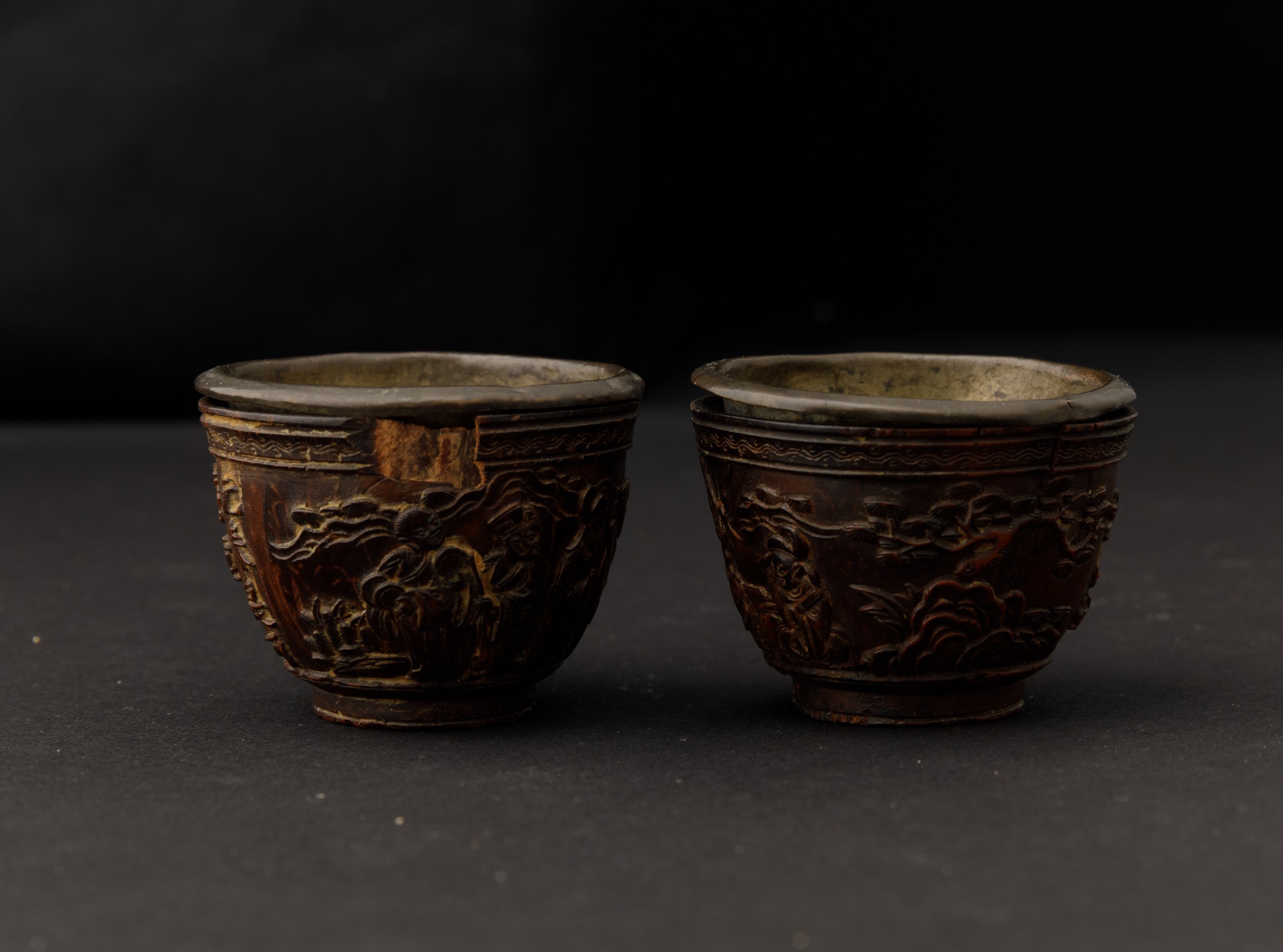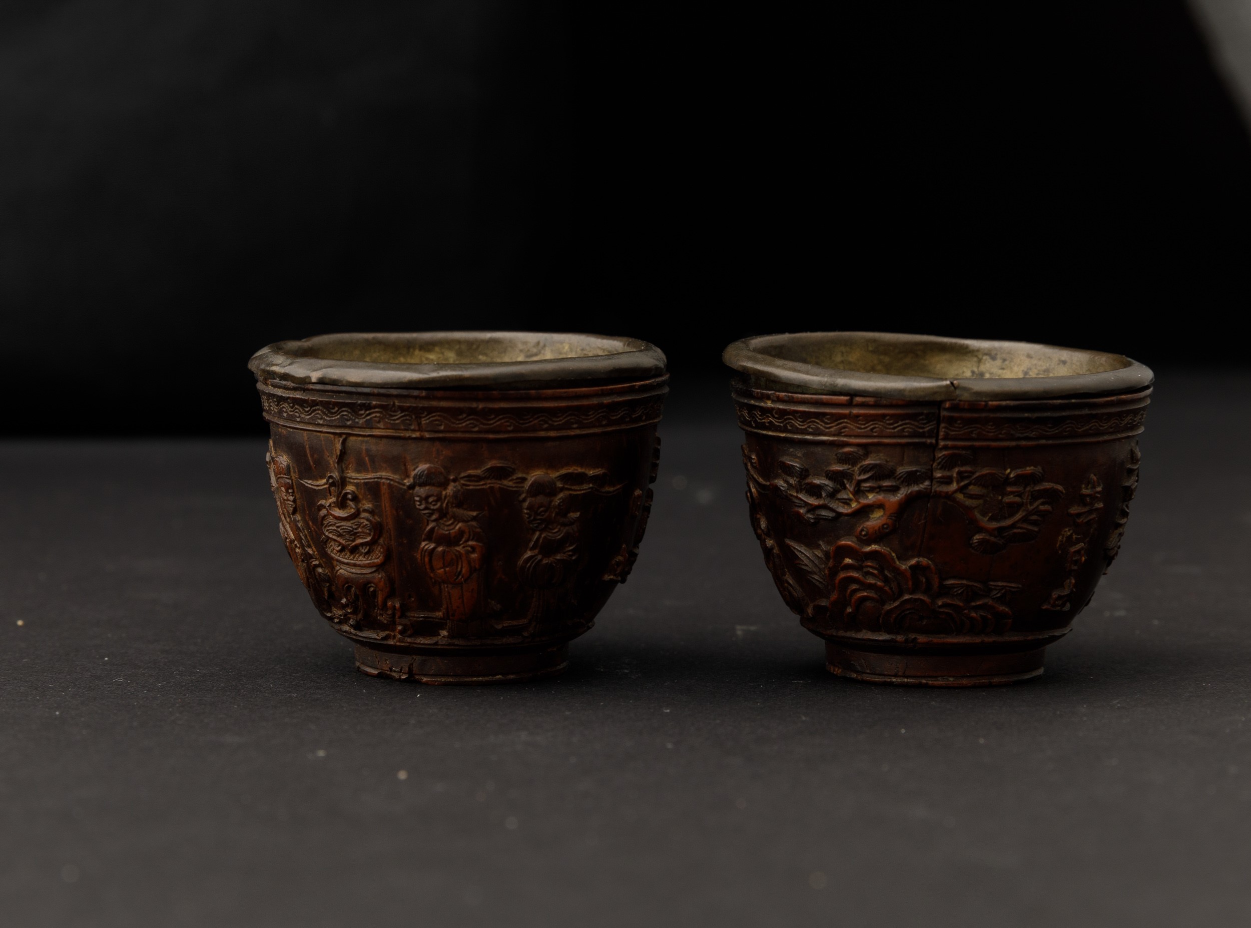 Due piccole coppe scolpite in legno con scene di vita comune e iscrizioni, Cina, [..]