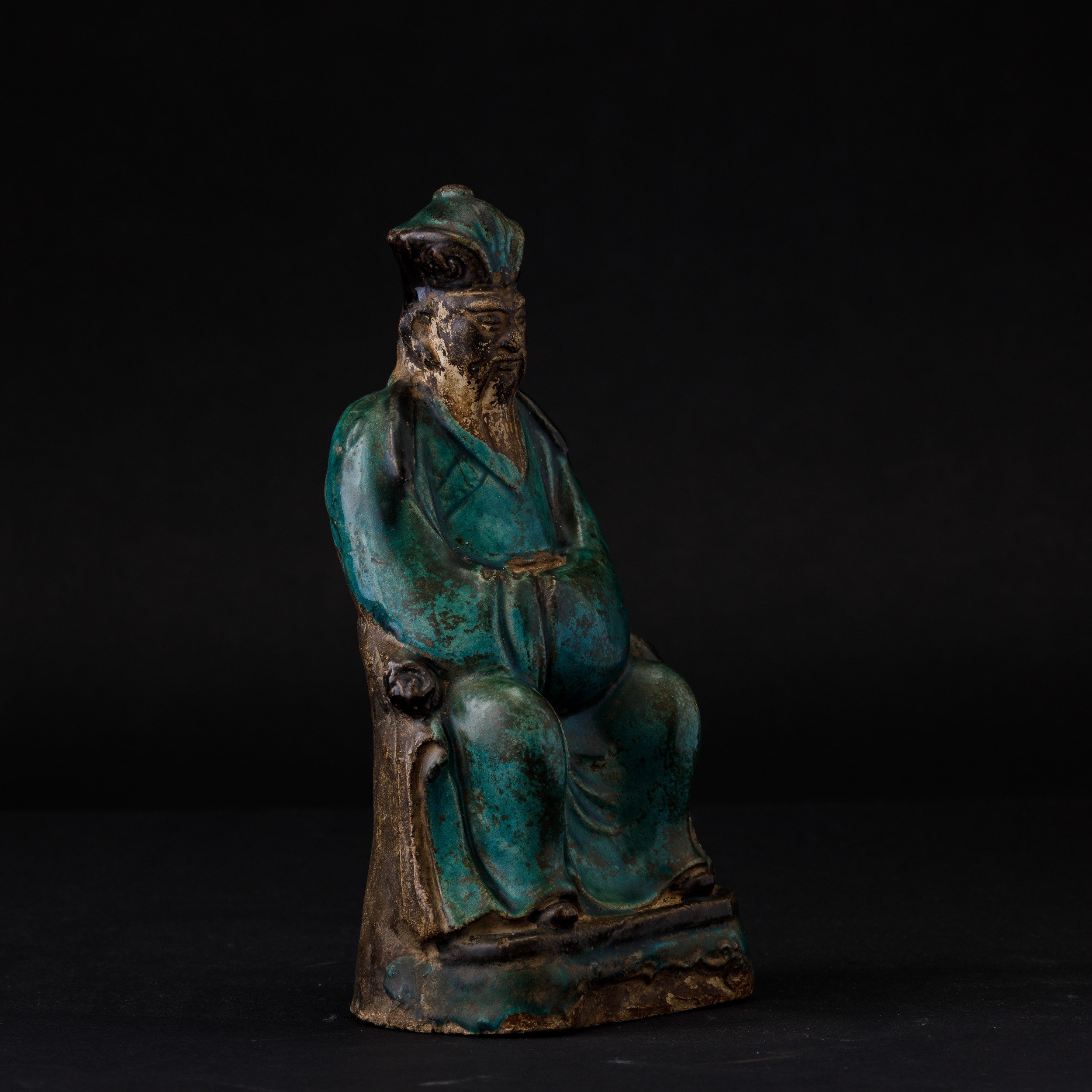 Figura di dignitario seduto in terracotta invetriata nei toni del turchese, Cina, [..]
