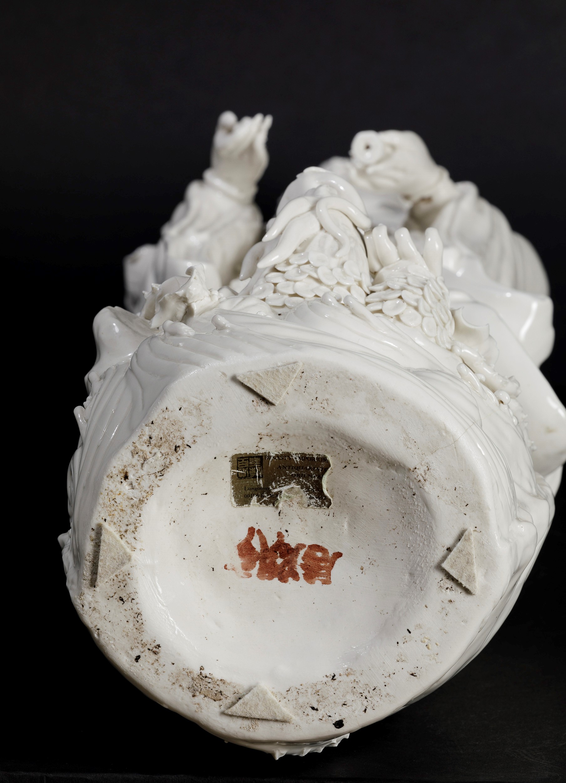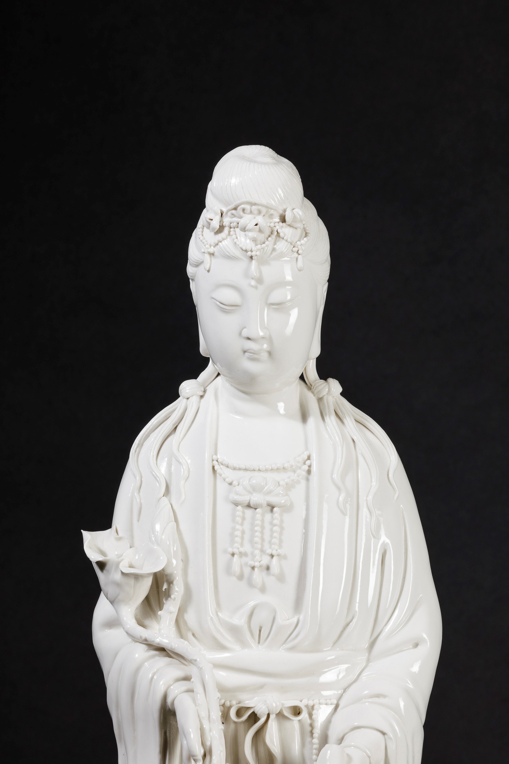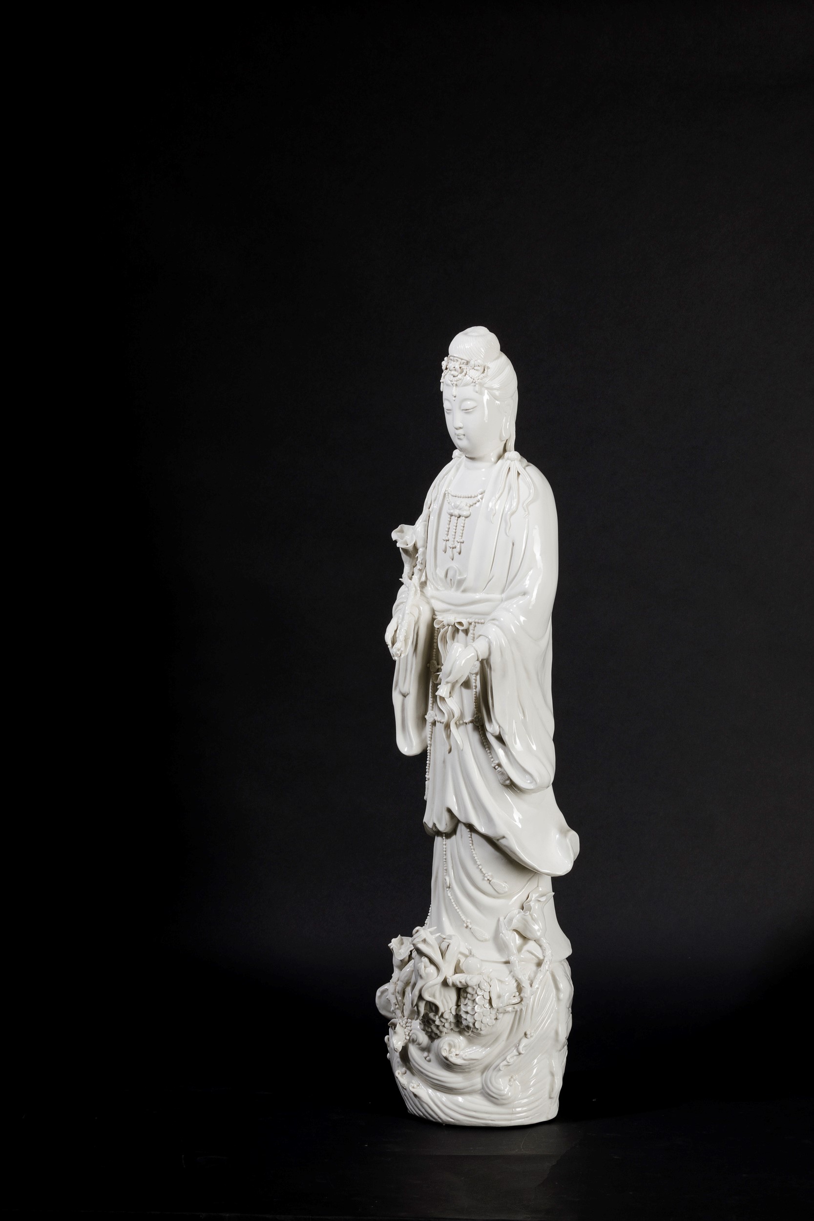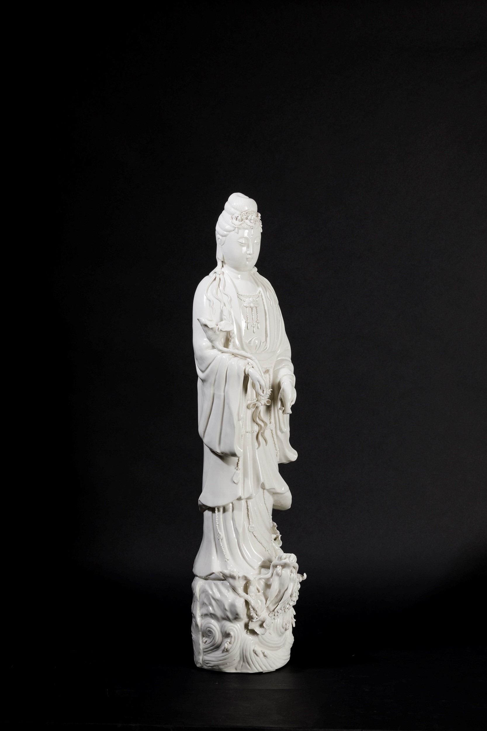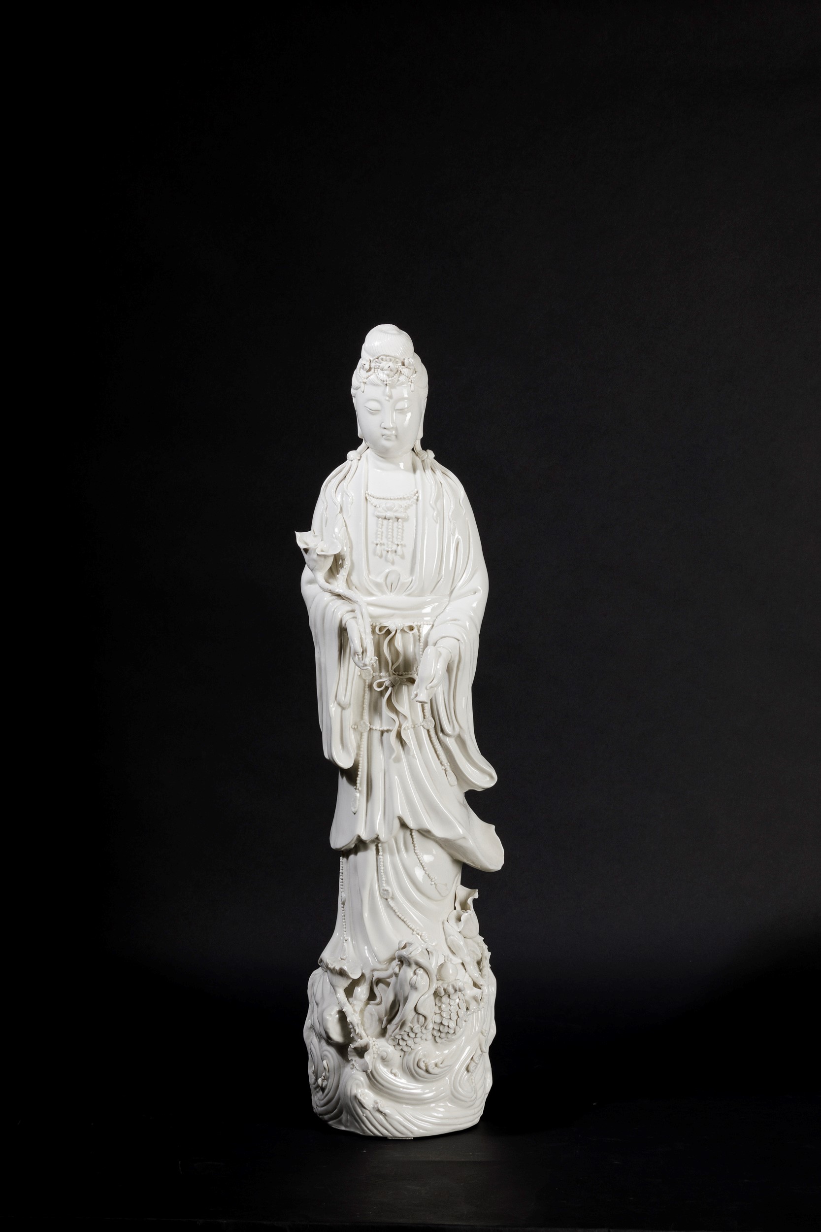 Figura in porcellana Blanc de Chine raffigurante Guanyin eretta su con vasetto, [..]