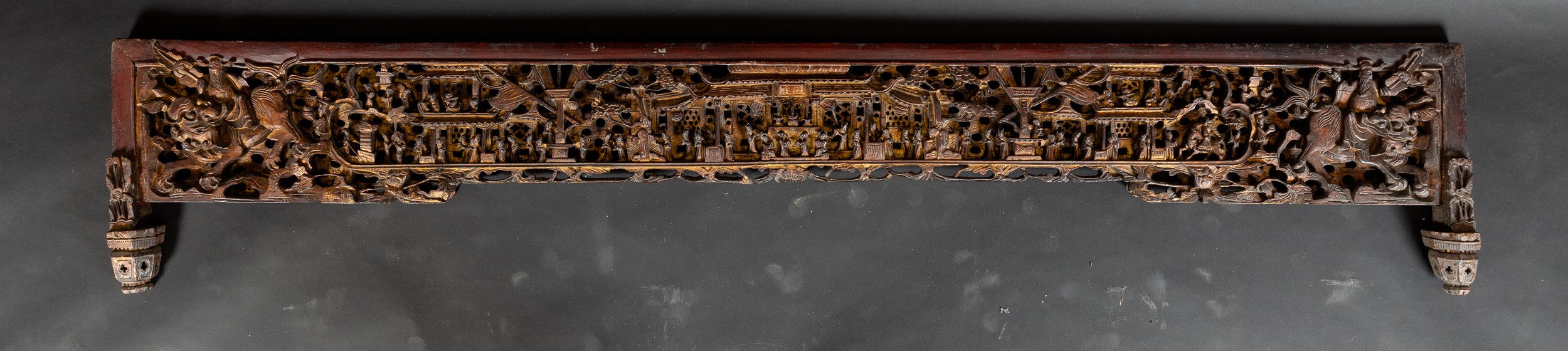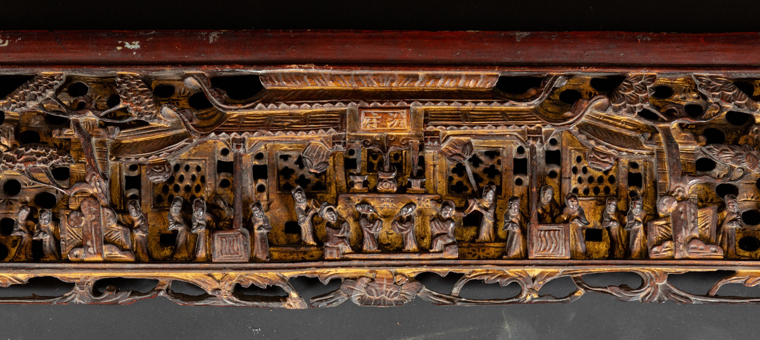 Fregio in legno intagliato e dorato raffigurante scena di vita comune e decori floreali, [..]