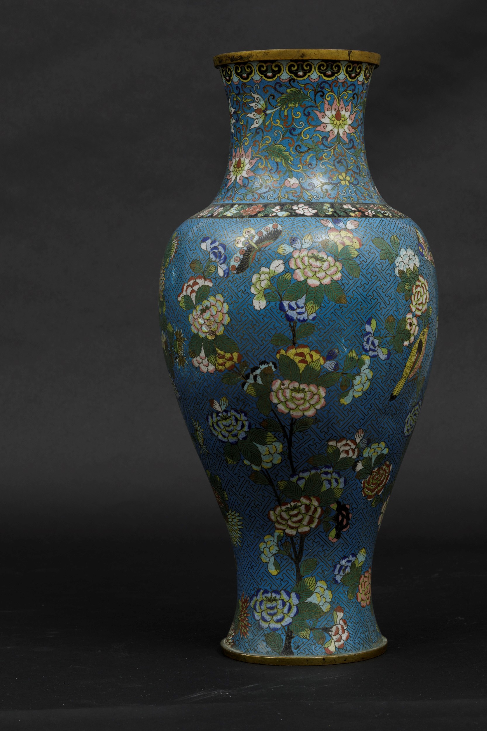 Grande vaso a smalti cloisonnè con decoro di uccellini tra i rami e farfalle, Cina, [..]