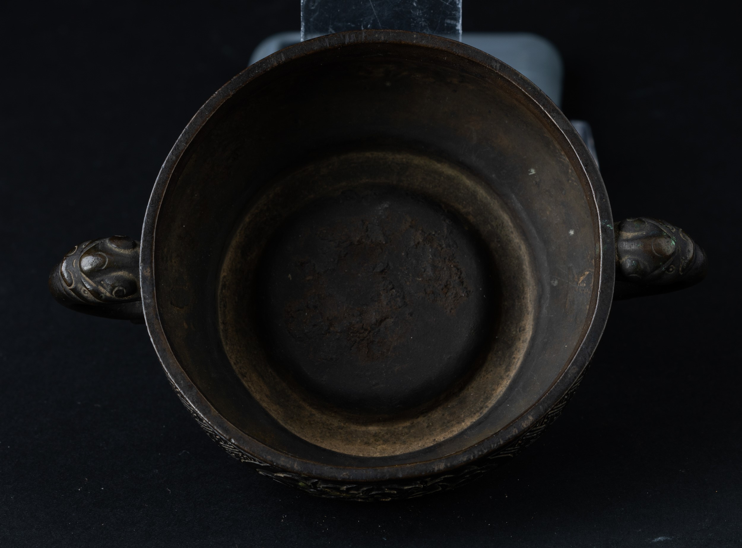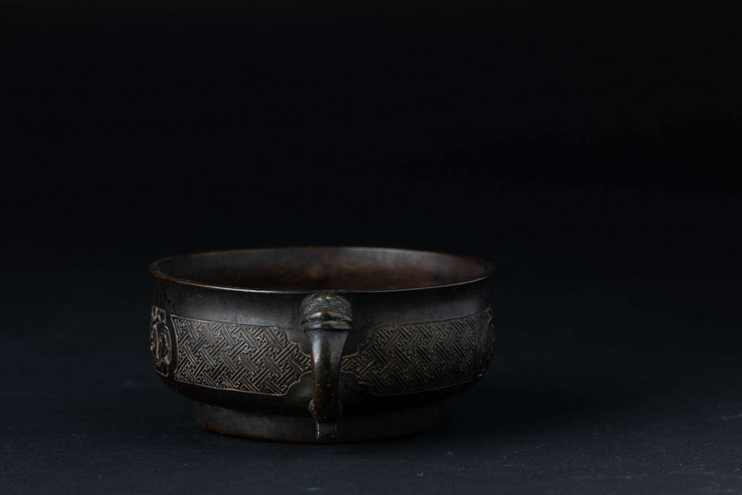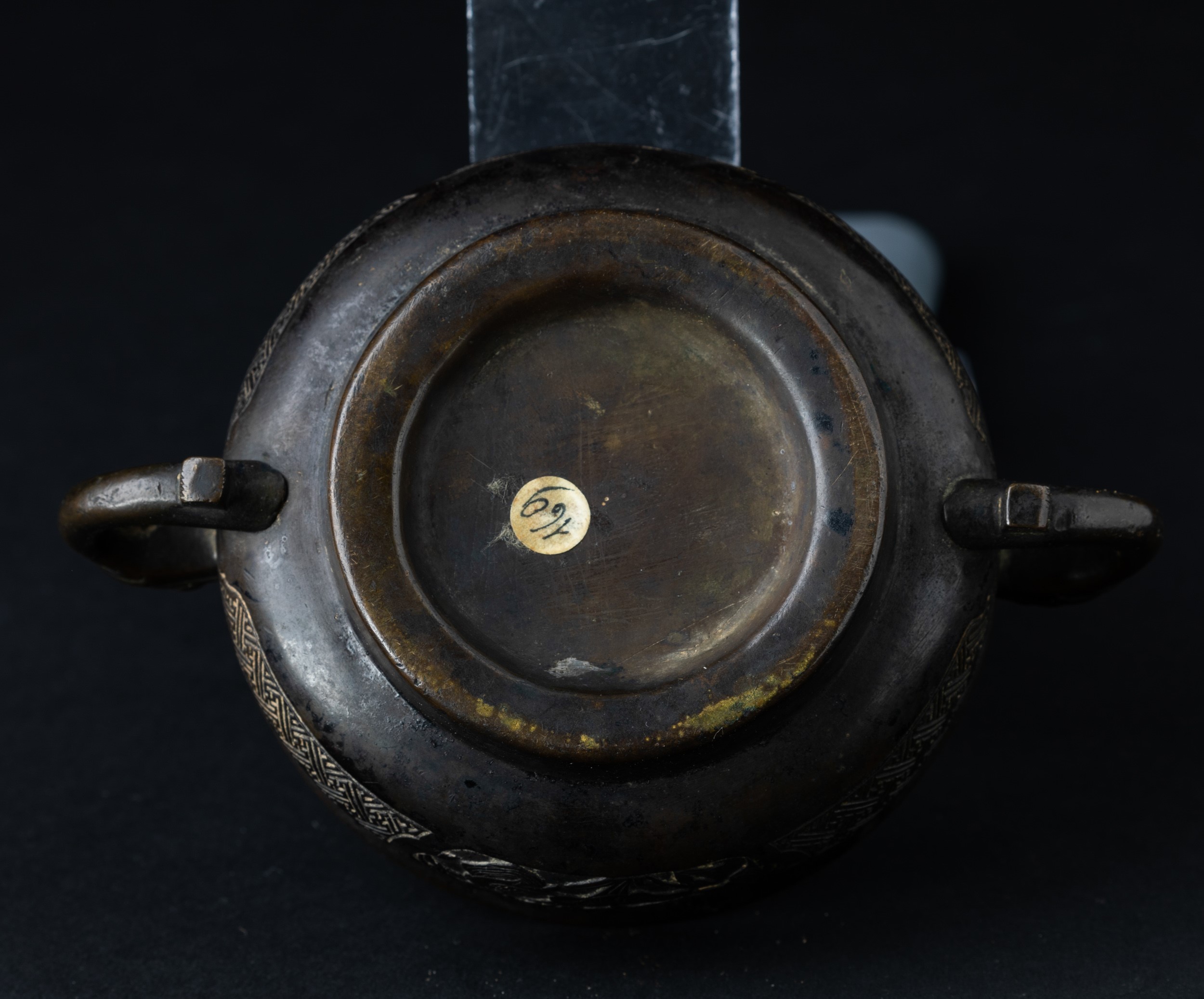 Incensiere in bronzo a doppia ansa con decori d’ispirazione arcaica incisi e a rilievo, [..]
