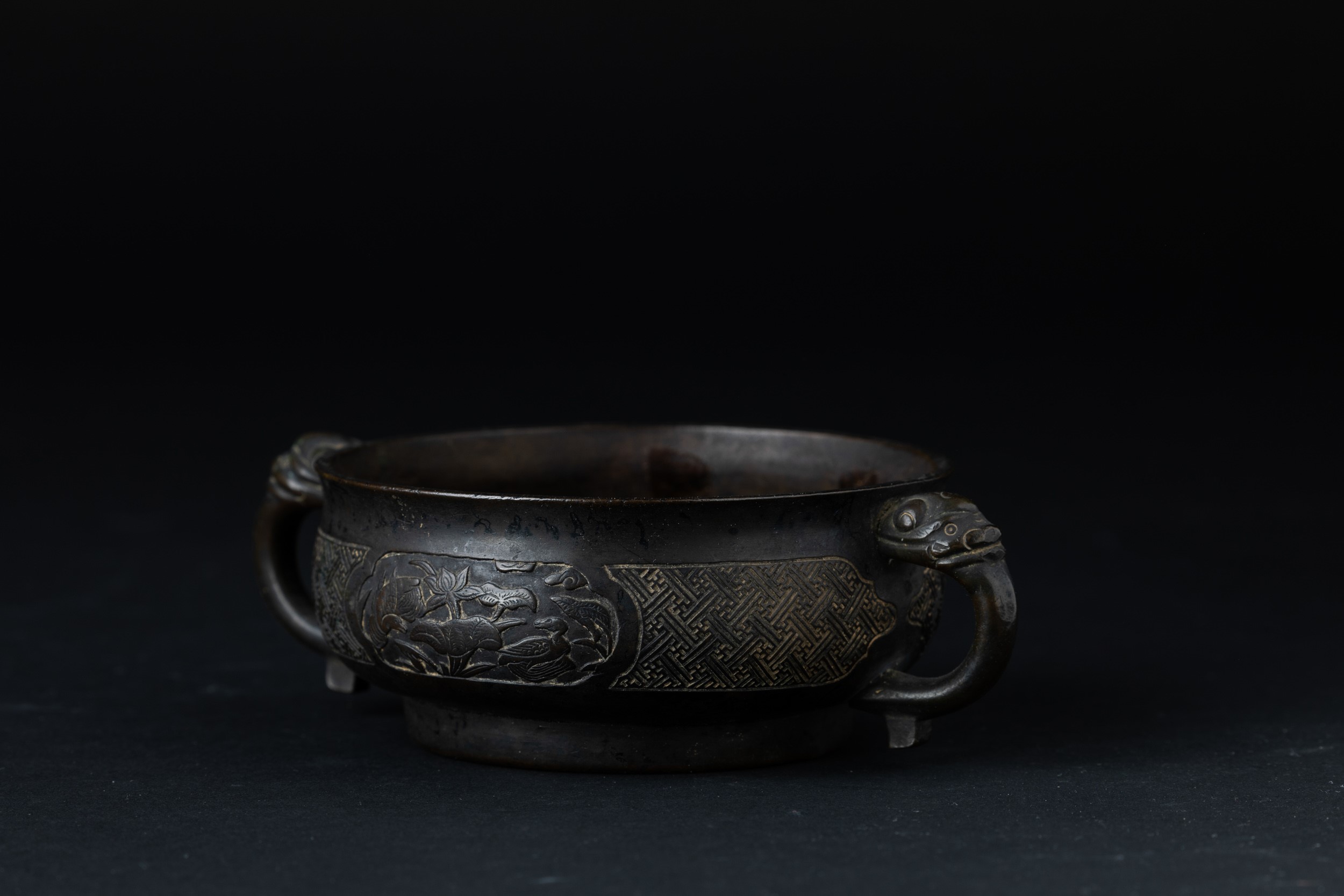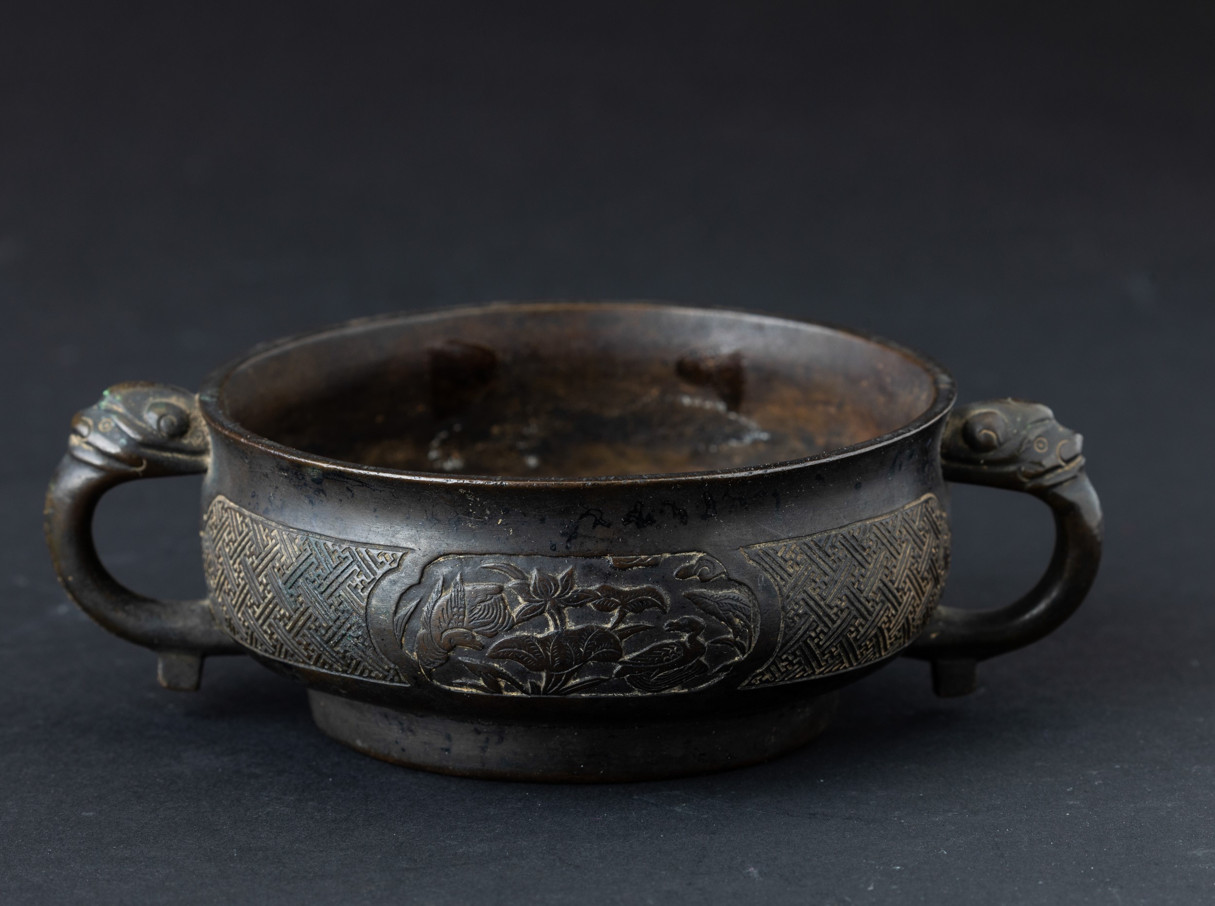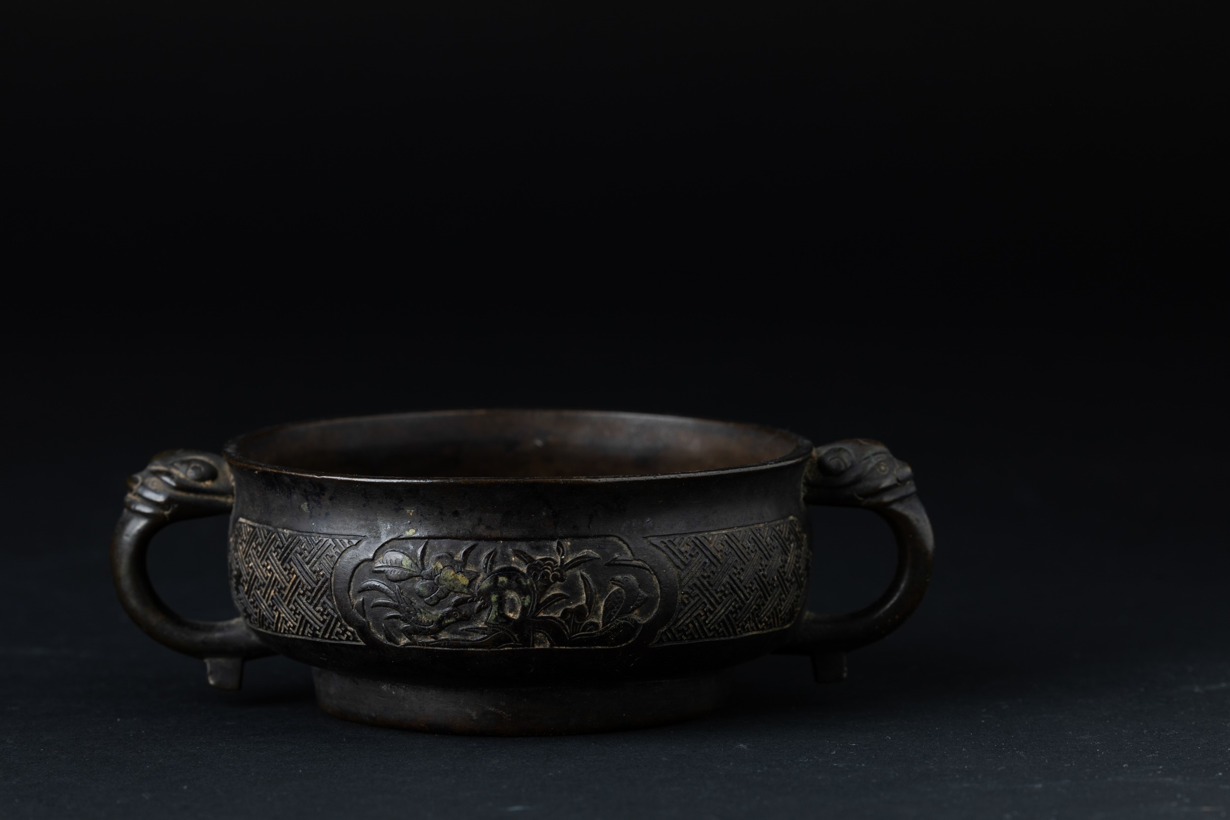 Incensiere in bronzo a doppia ansa con decori d’ispirazione arcaica incisi e a rilievo, [..]
