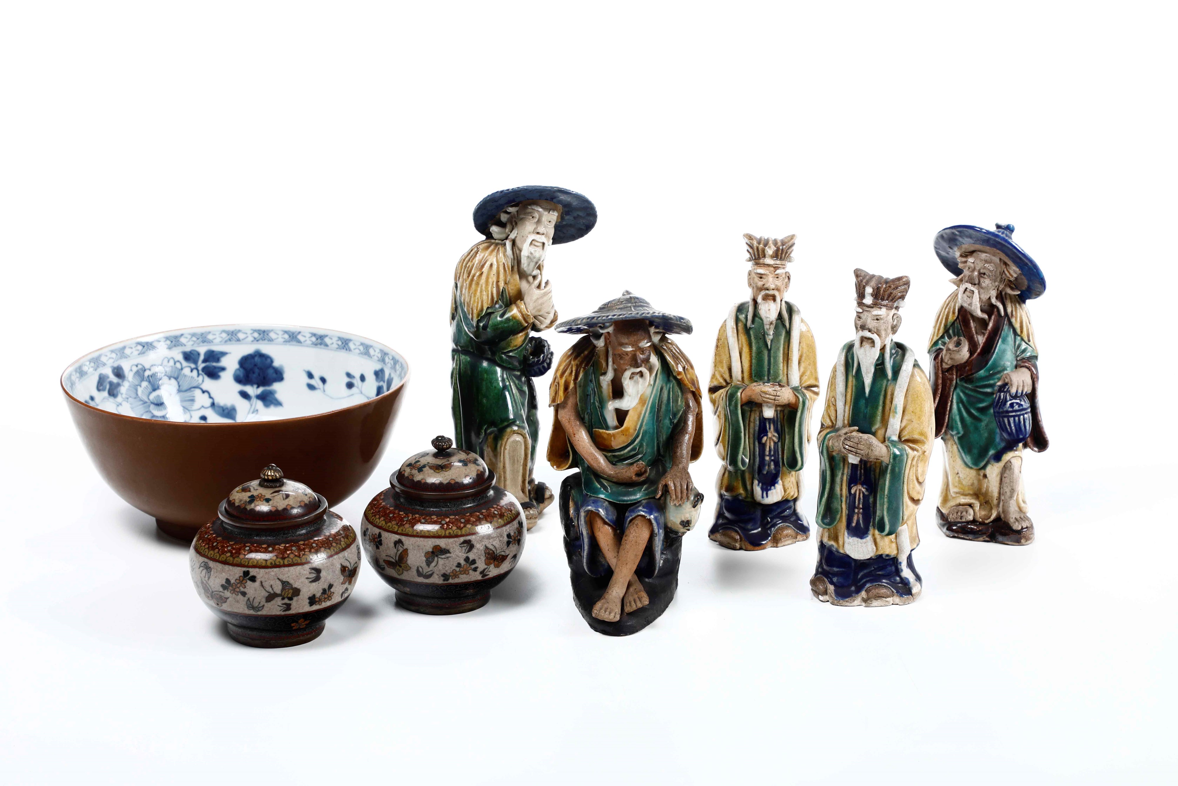Lotto composto da cinque figure e una ciotola in porcellana e due vasetti in smalto, [..]
