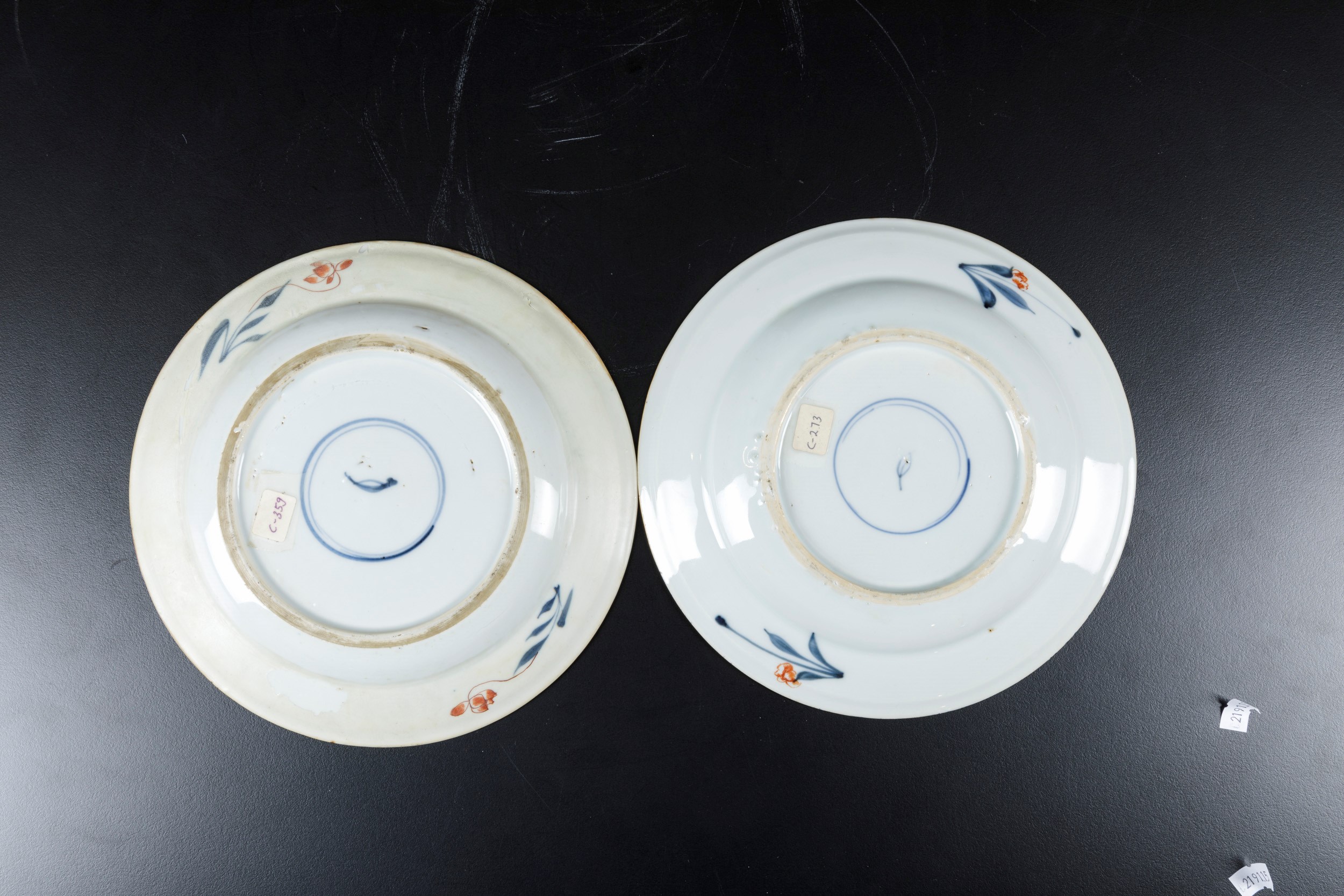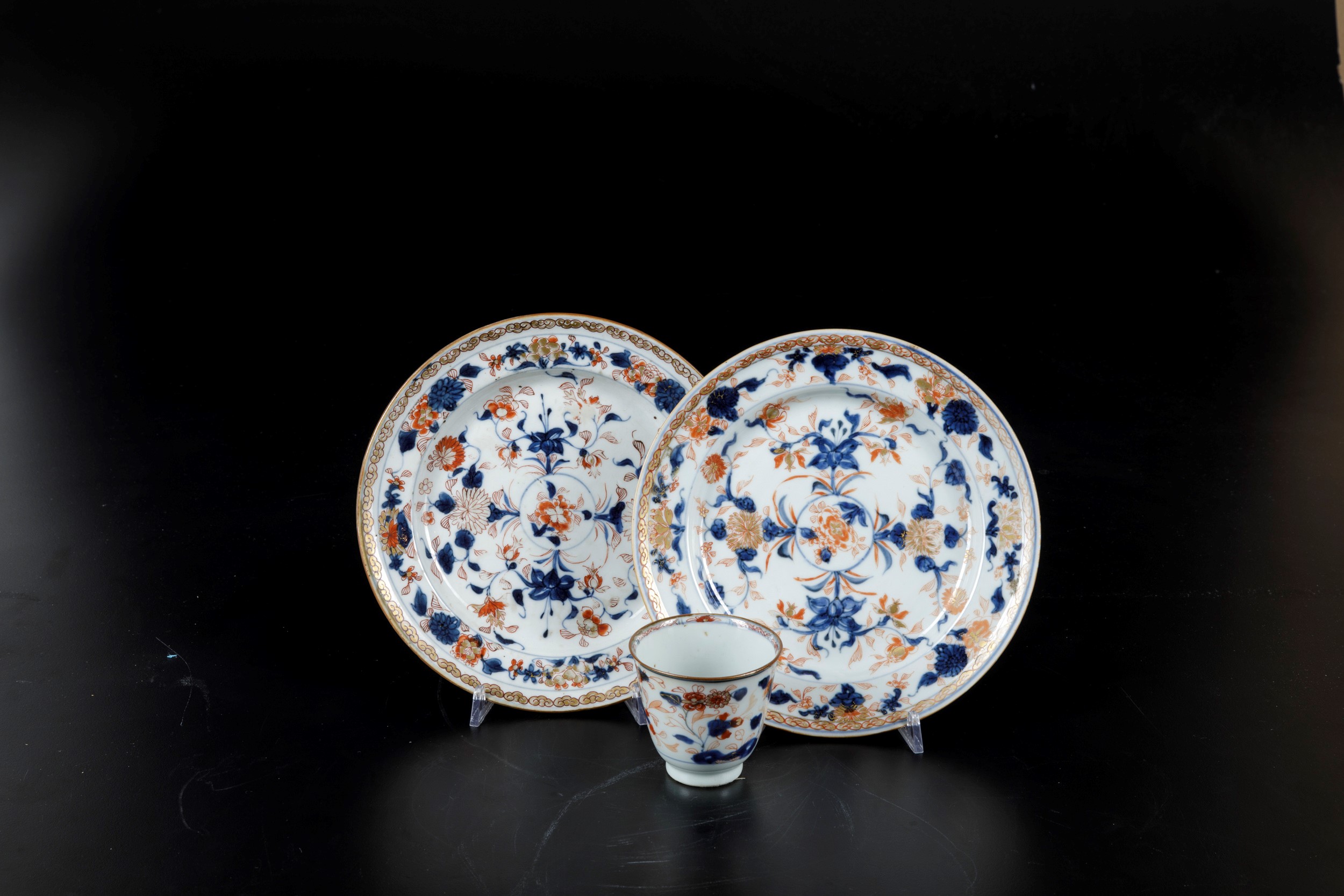 Lotto composto da due piatti e un bicchiere in porcellana Imari con decori floreali, [..]