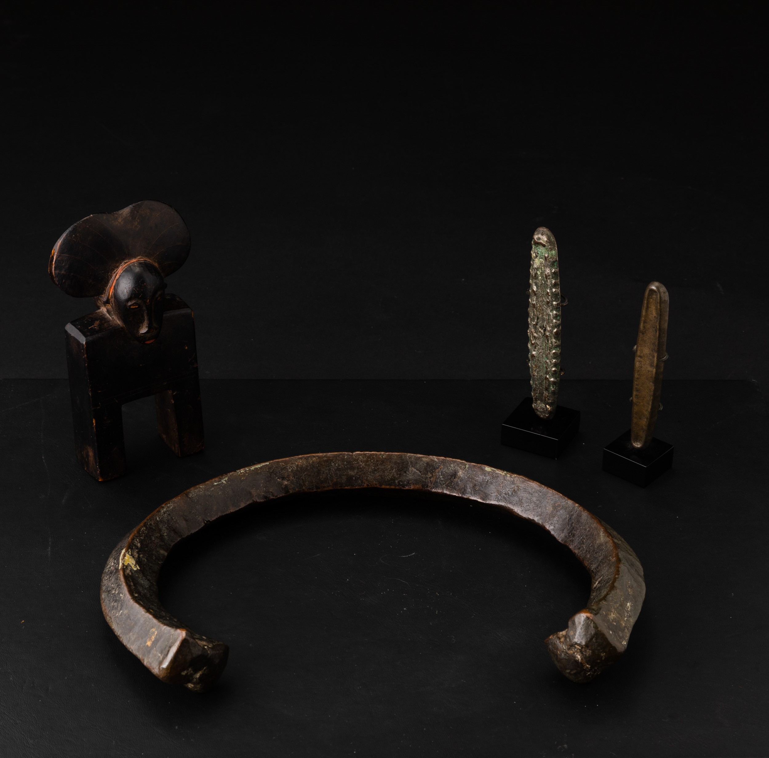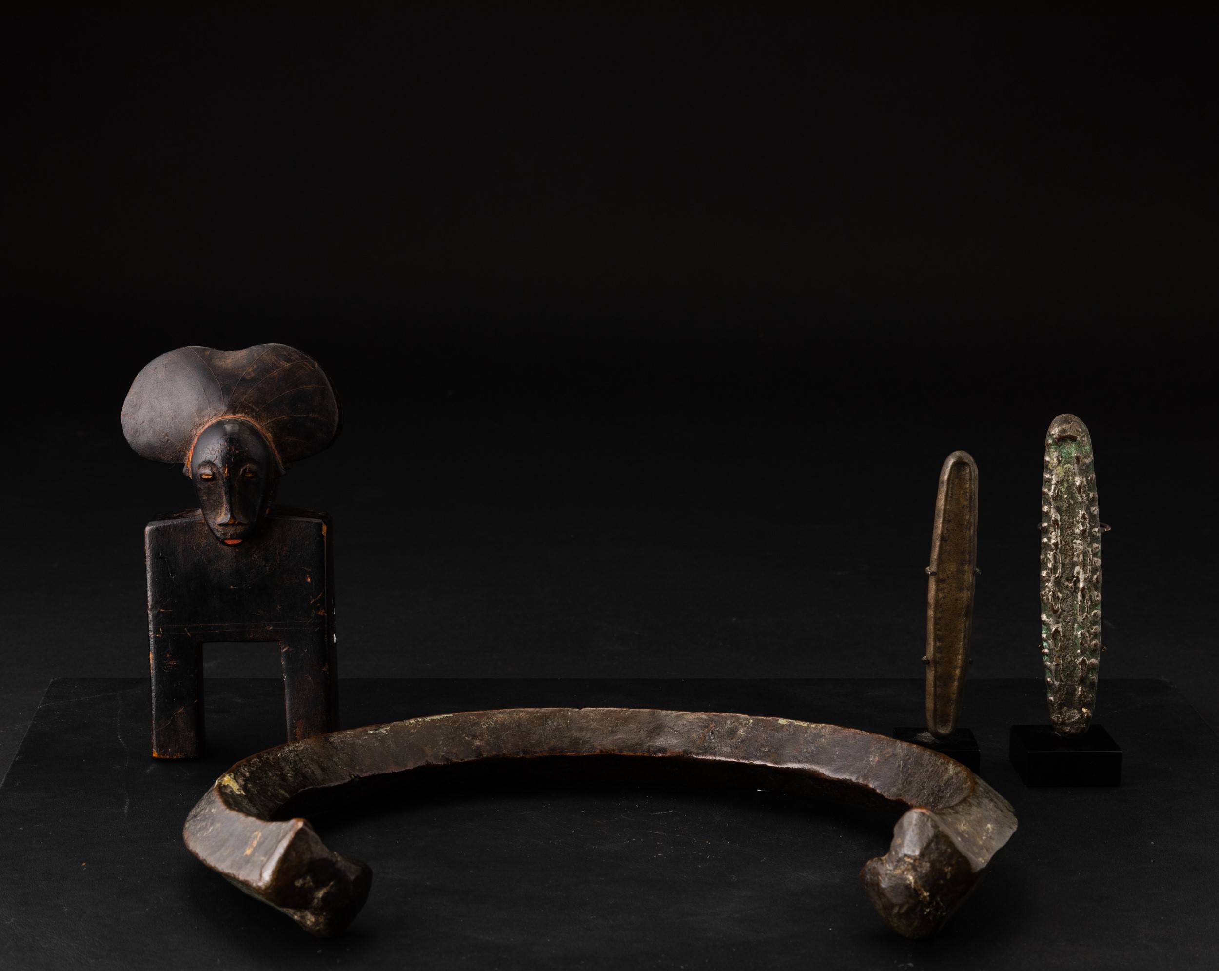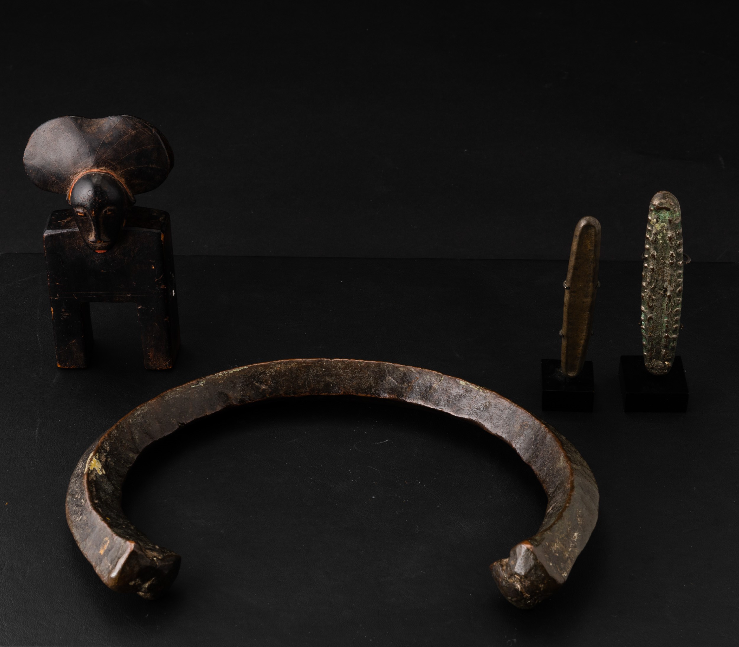 Lotto composto da tre oggetti in bronzo e una bilancia in legno ebanizzato
