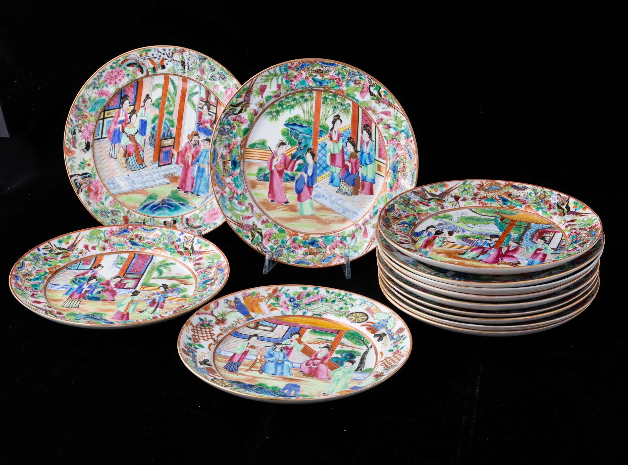 Lotto composto da tredici piatti in porcellana Famiglia Rosa con scene di vita comune [..]