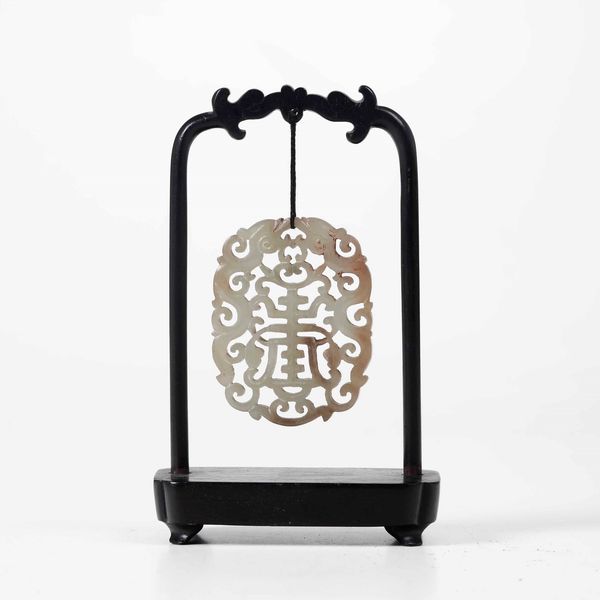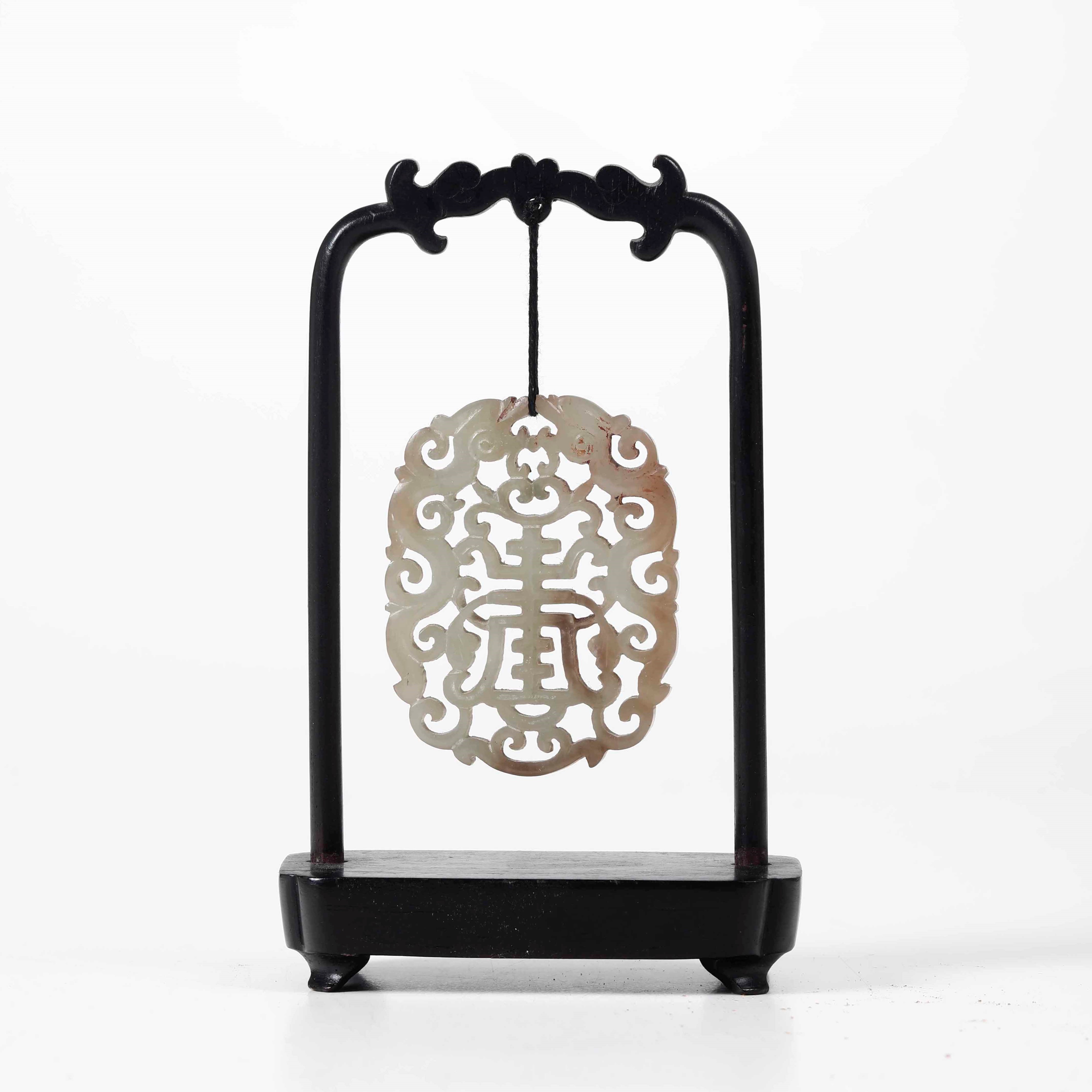 Pendente scolpito in giada con decoro a traforo e stand in legno, Cina, Dinistai [..]