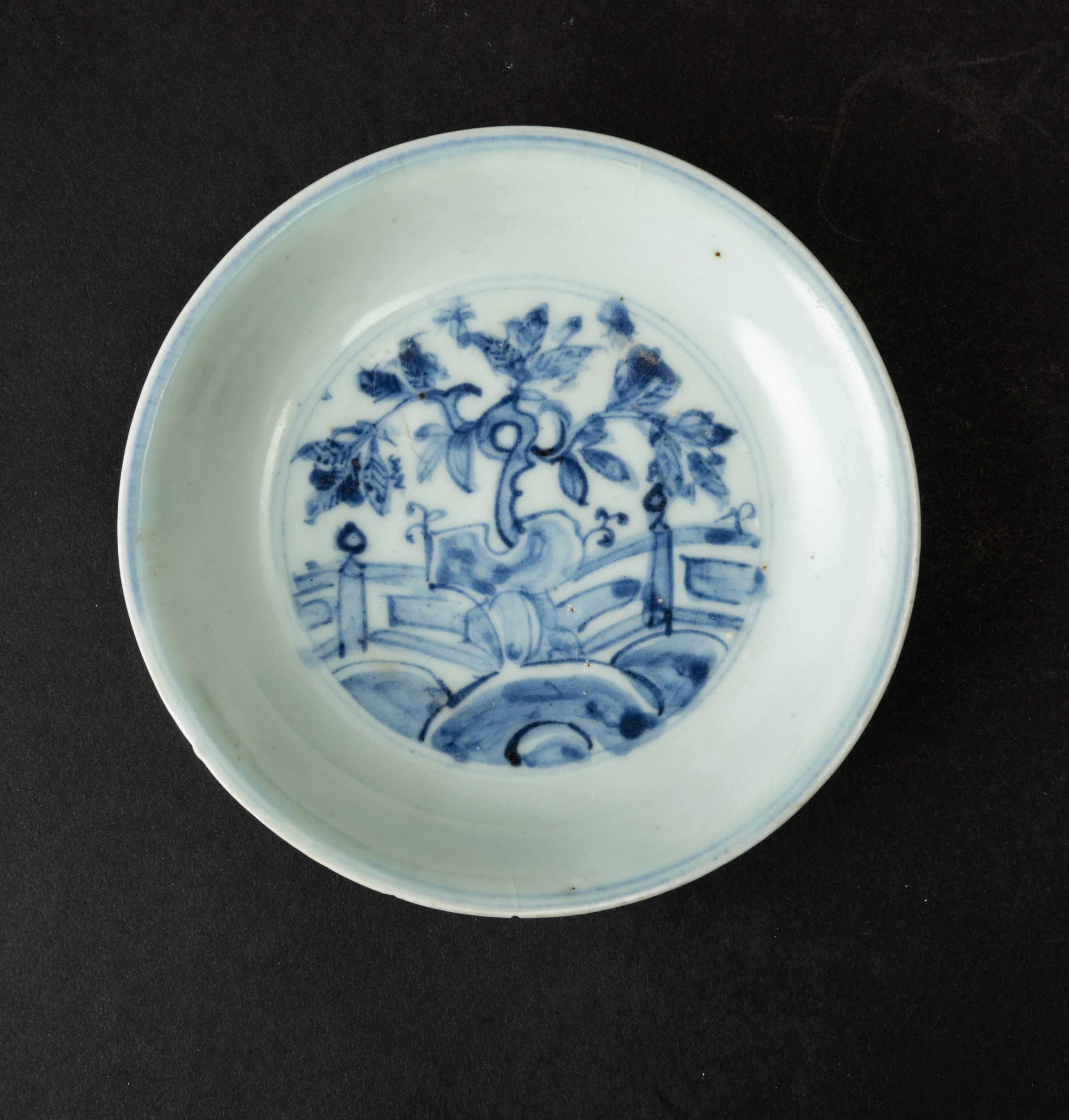 Piatto in porcellana bianca e blu con paesaggio centrale e decori vegetali, Cina, [..]