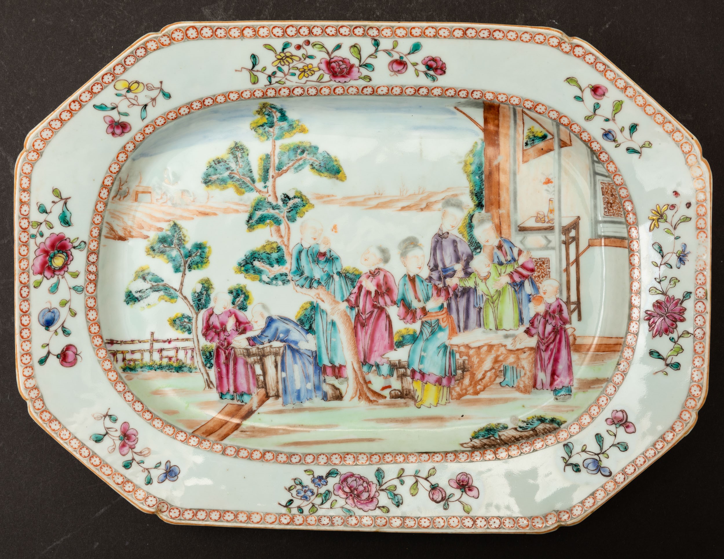 Piatto ottagonale in porcellana Famiglia Rosa raffigurante scena di vita comune [..]