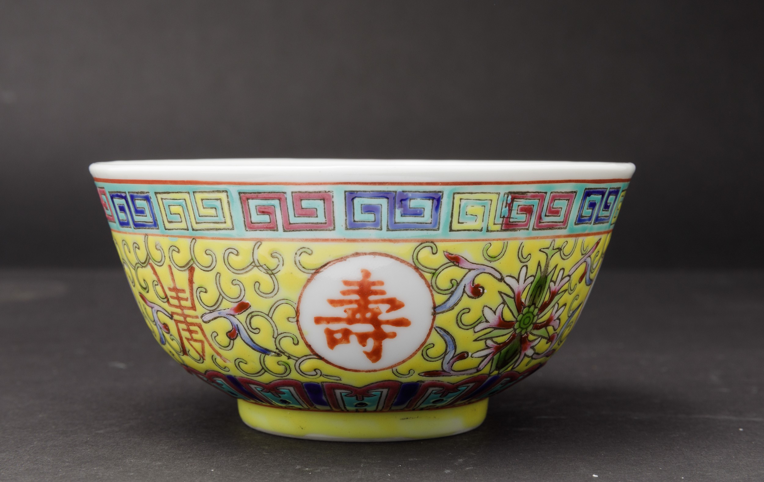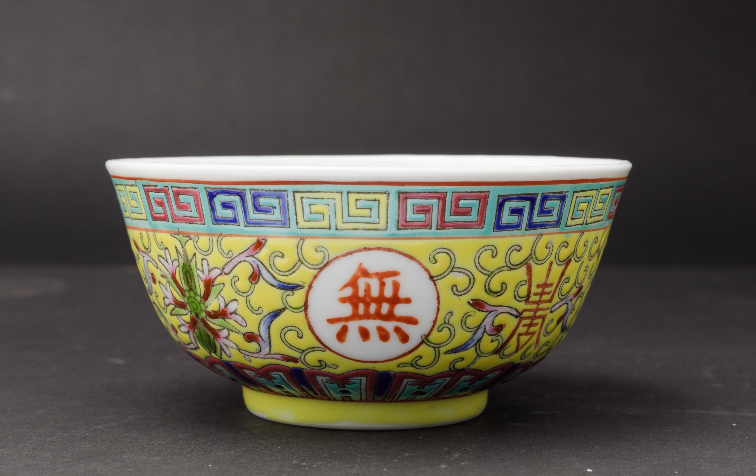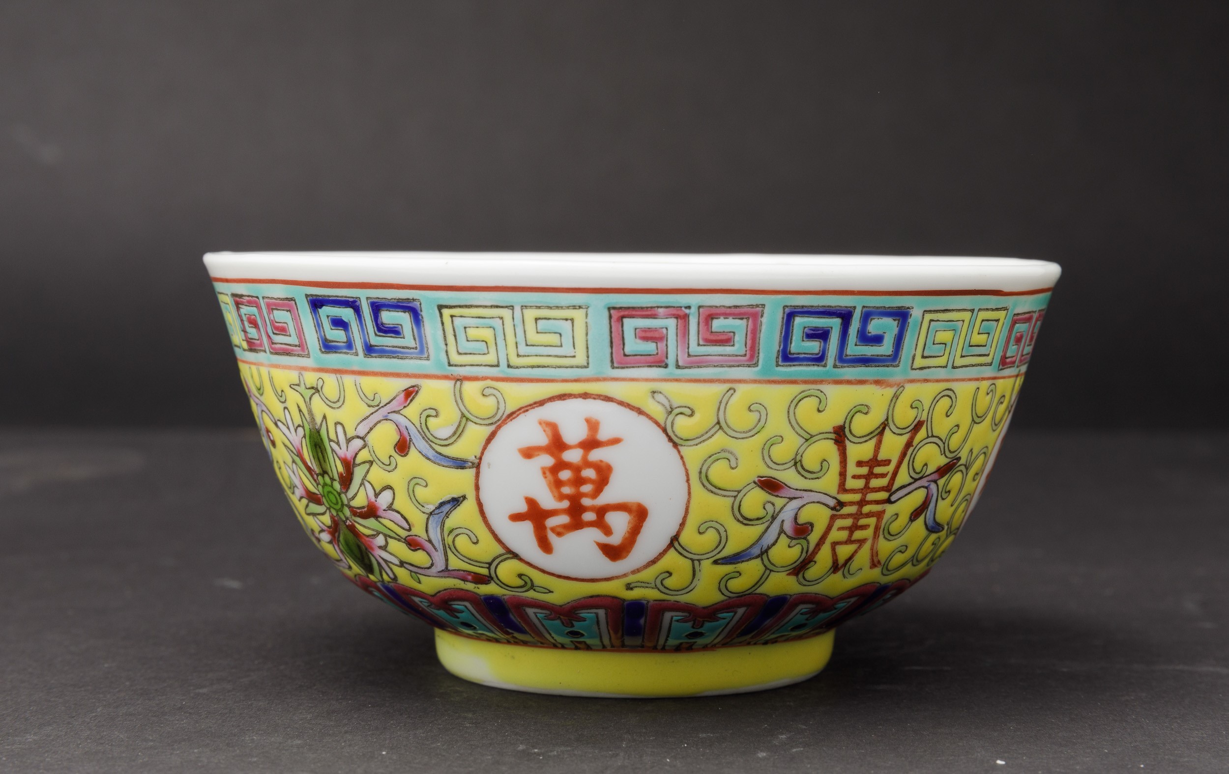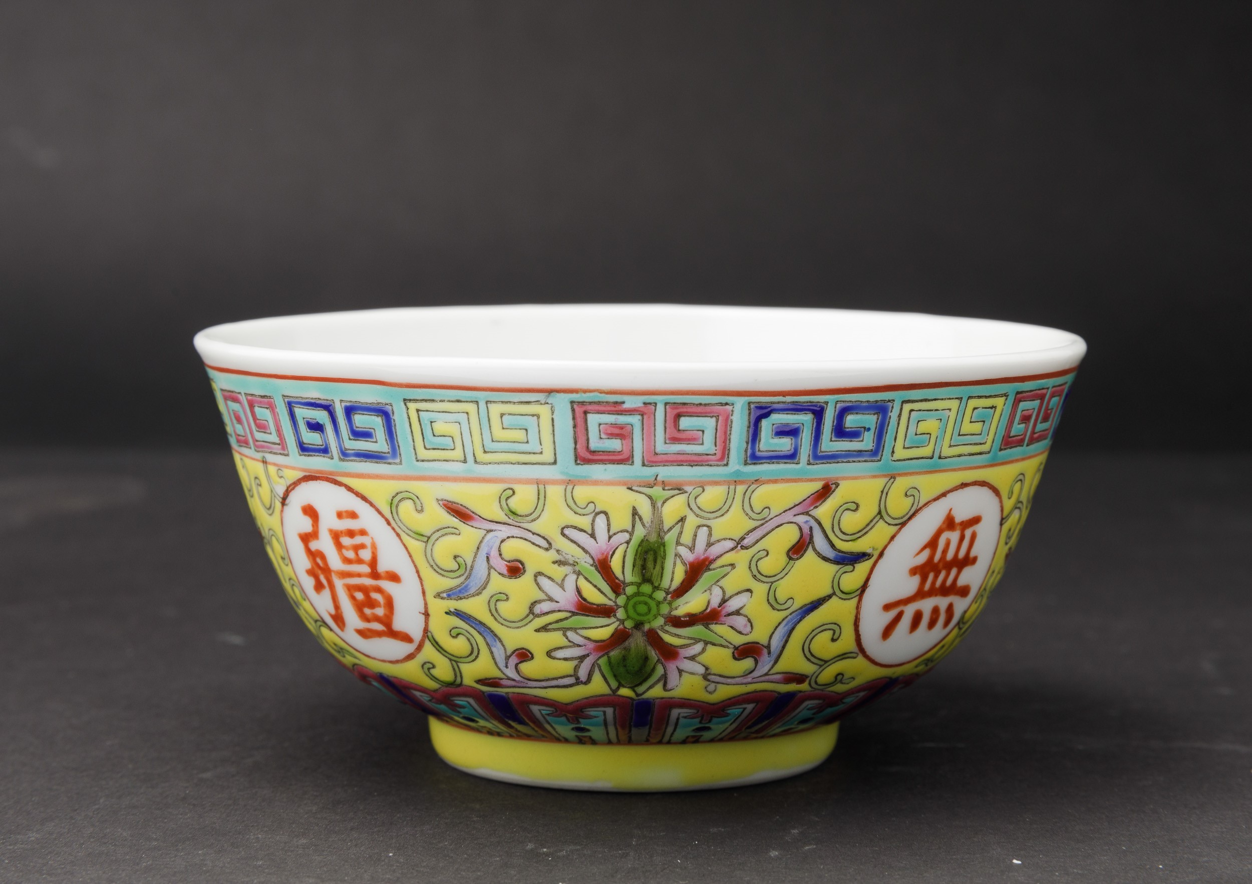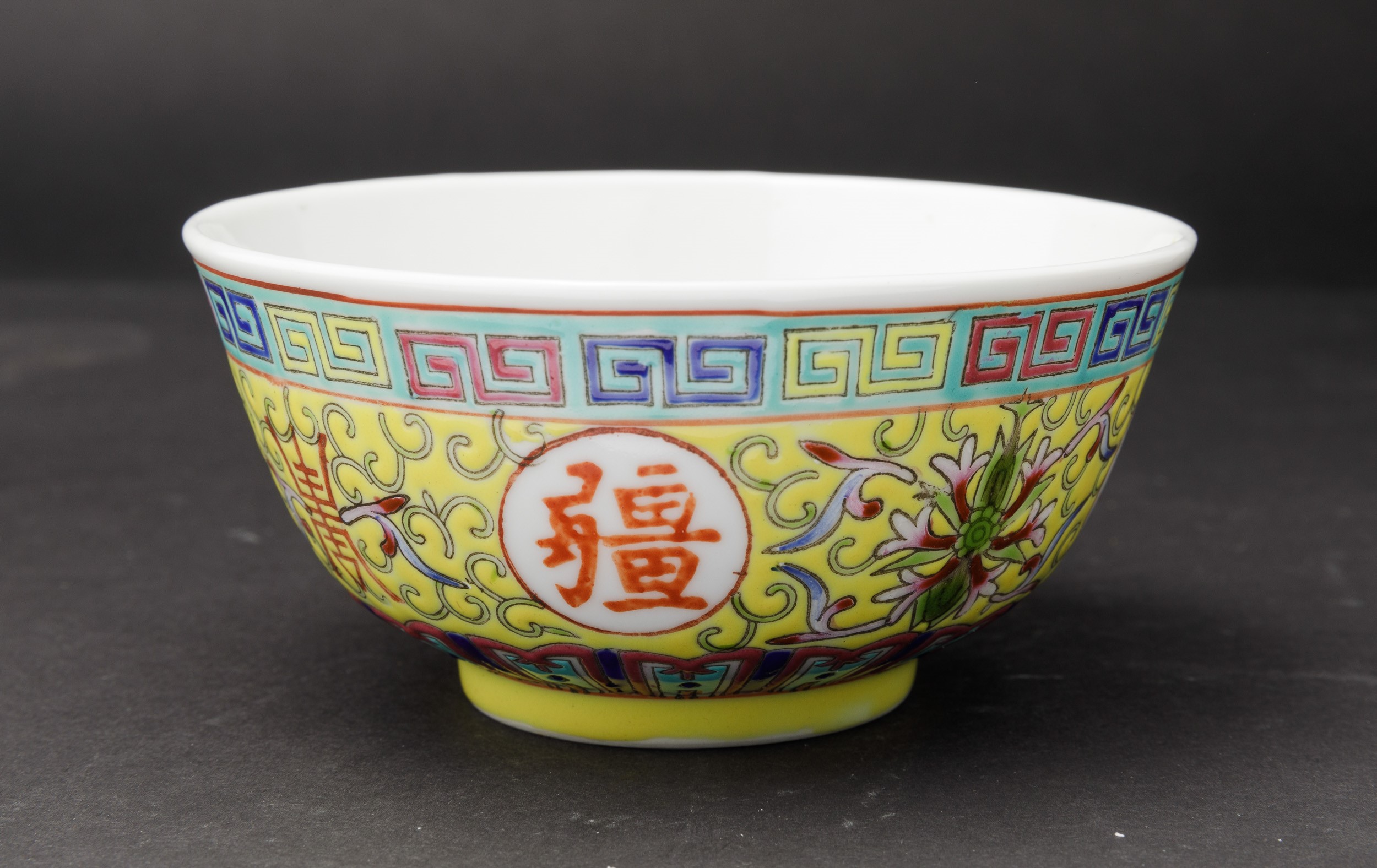Piccola ciotola in porcellana a smalti policromi con simboli taoisti, fiori di loto [..]