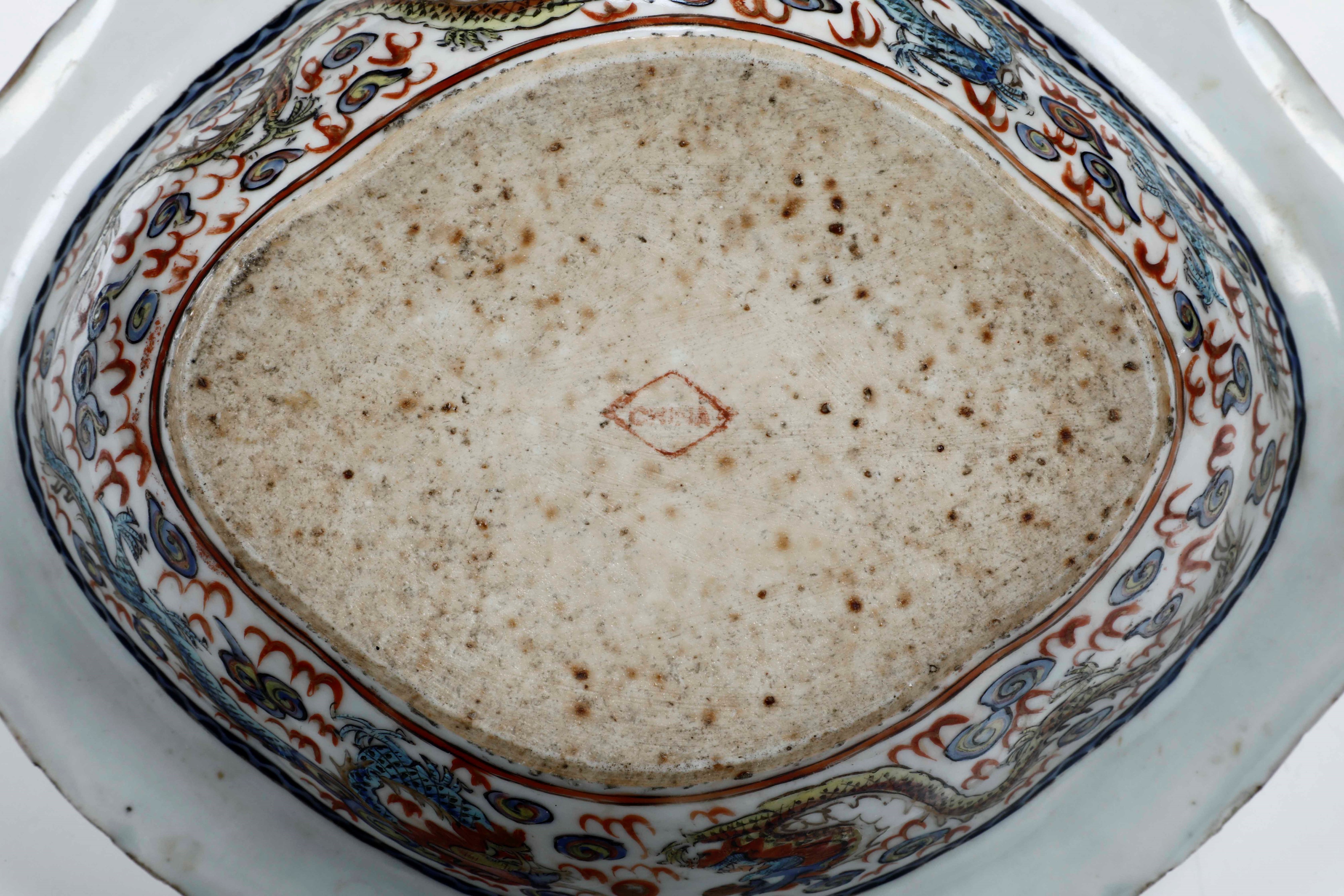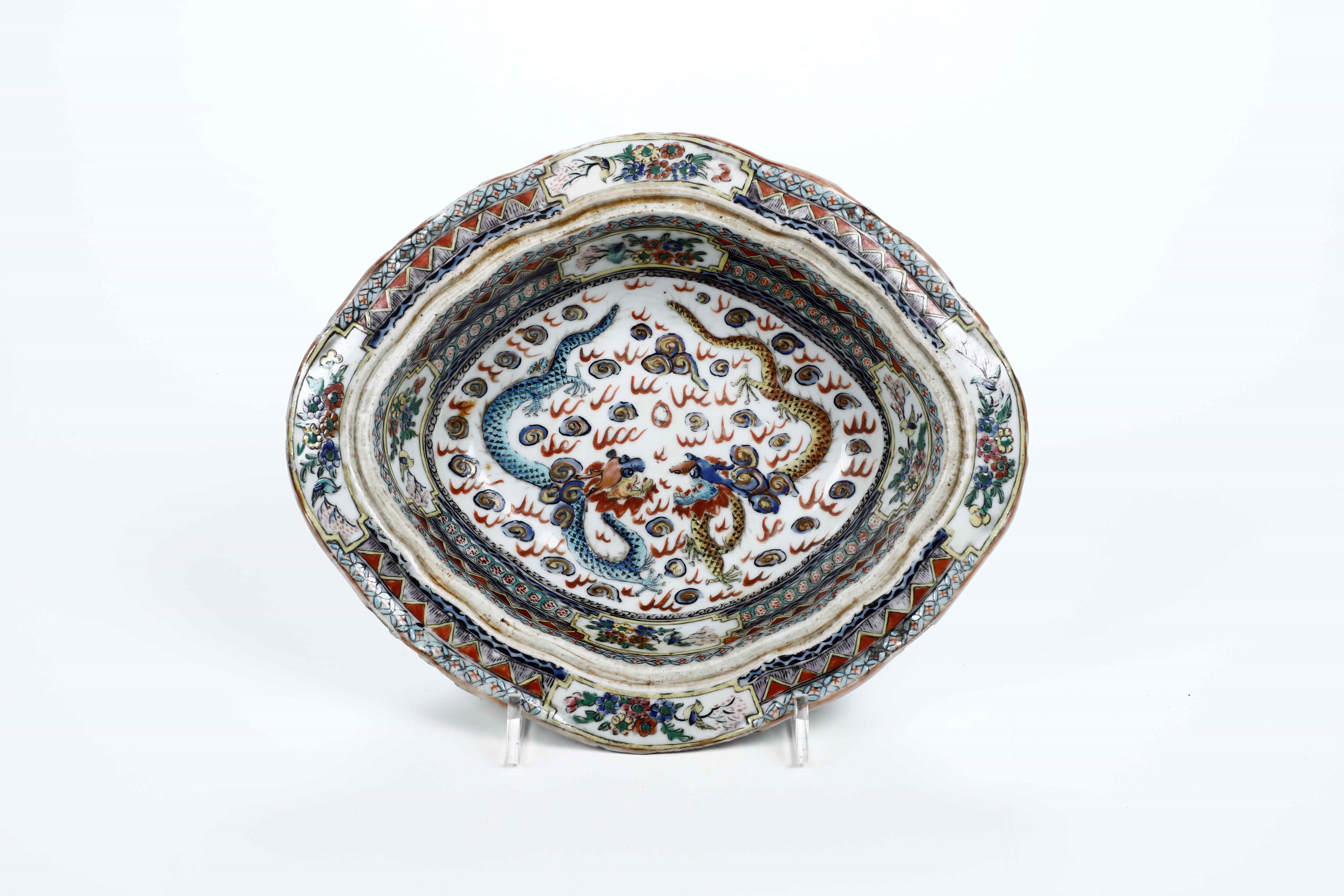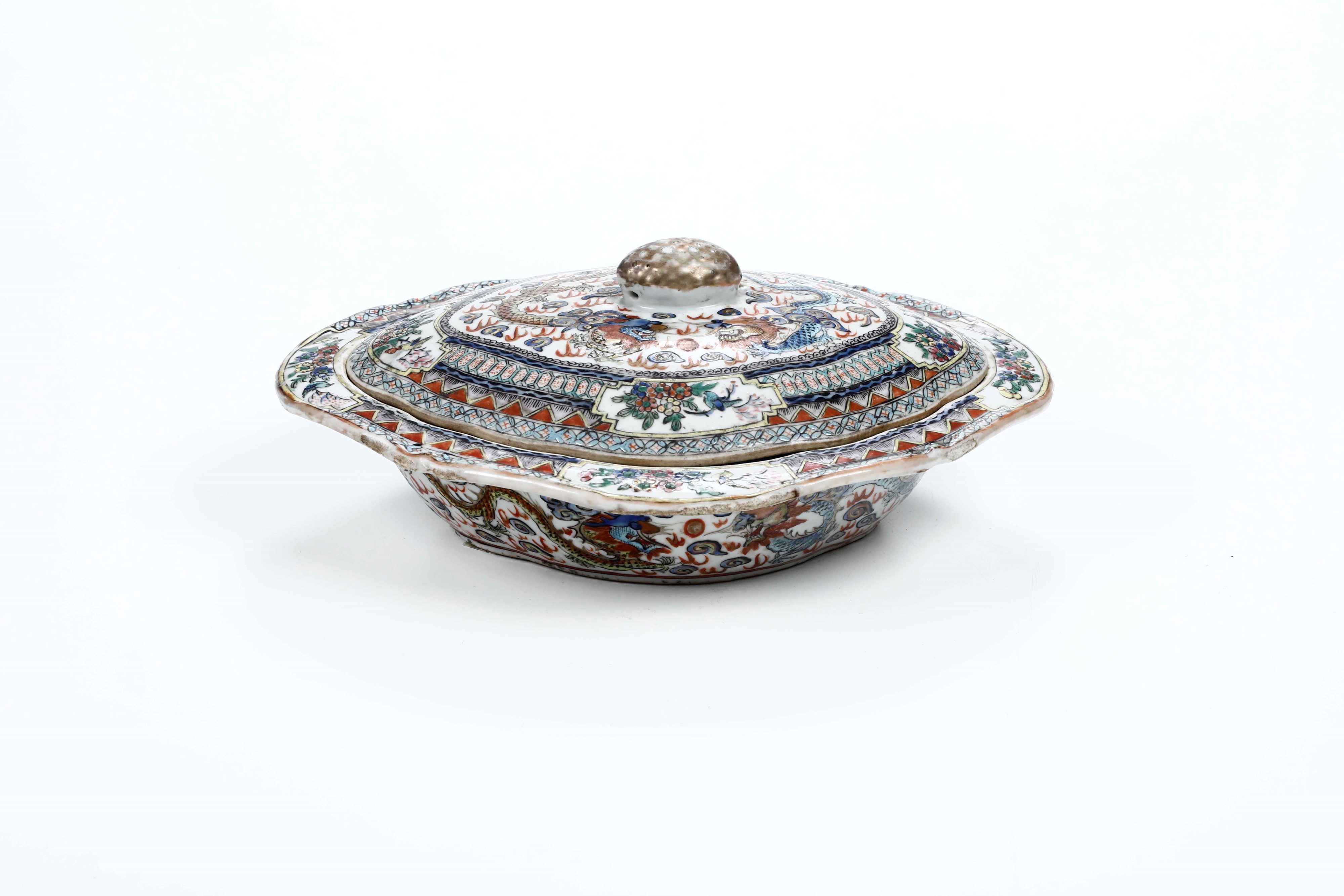 Portavivande in porcellana con coperchio, figure di draghi tra le nuvole e soggetti [..]