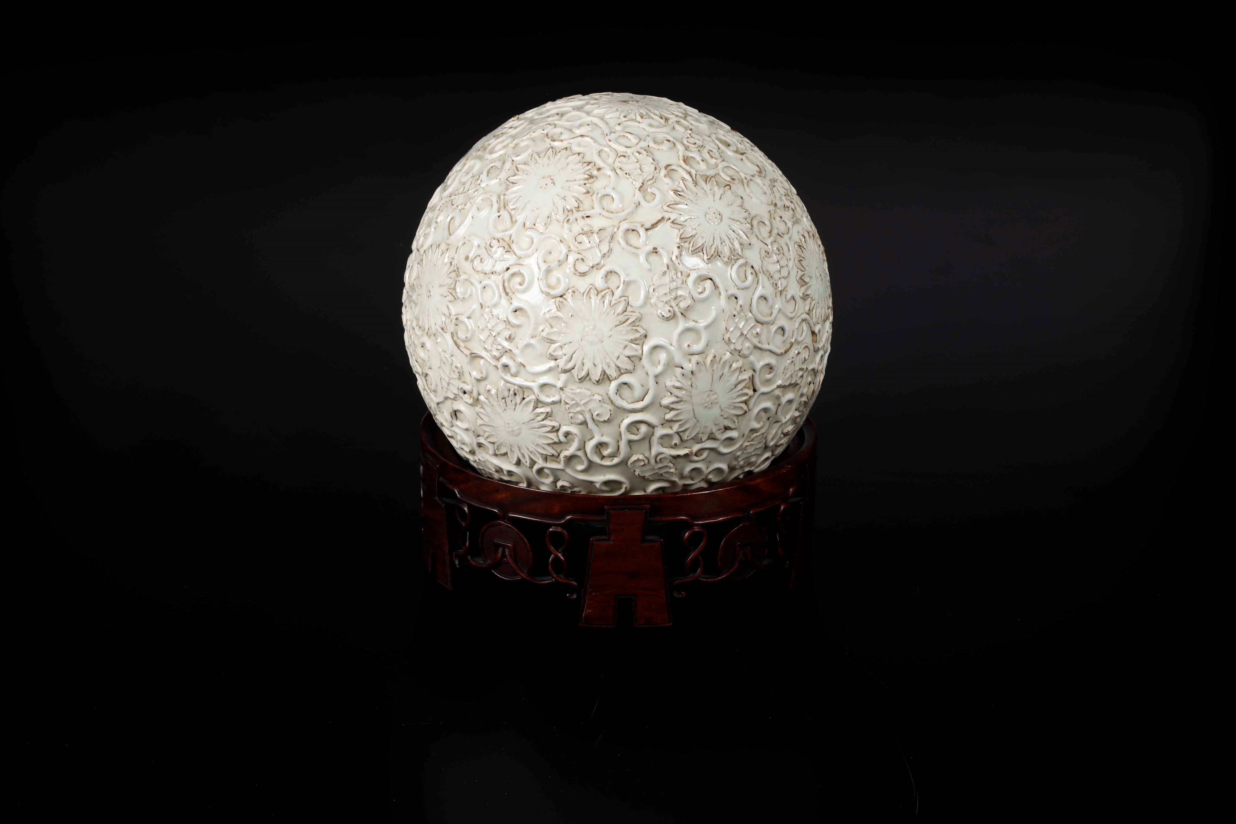 Sfera in porcellana Blanc de Chine con decori floreali a rilievo, Cina, Dinastia [..]
