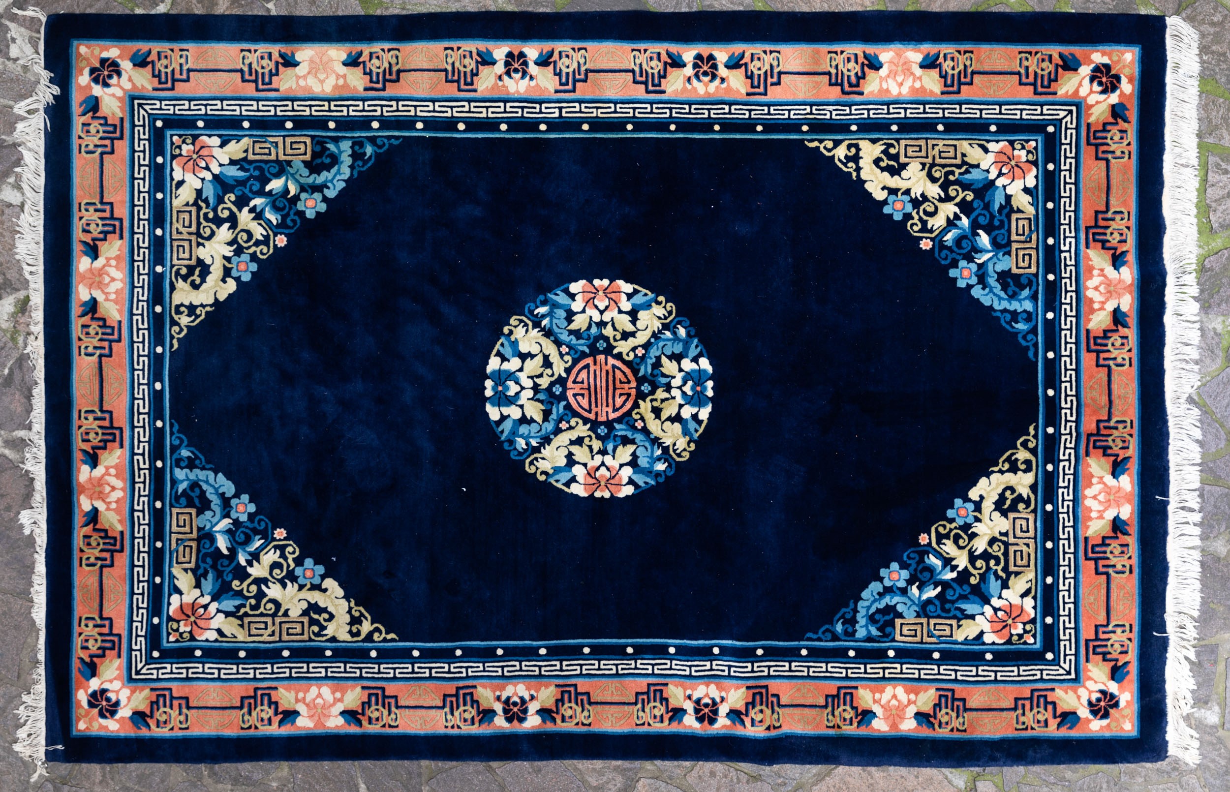 Tappeto con medaglione centrale e decori floreali su fondo blu, Cina, XX secolo