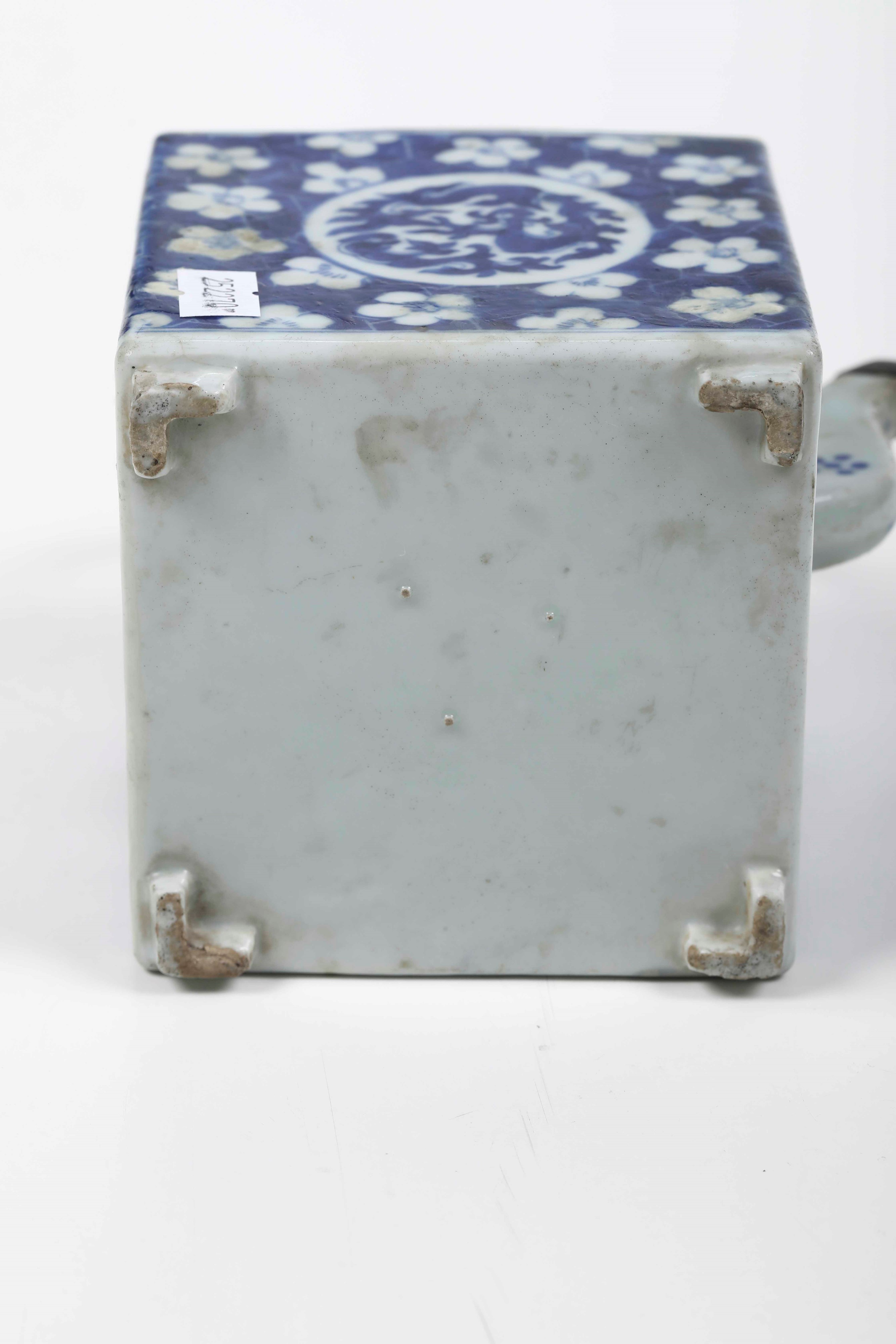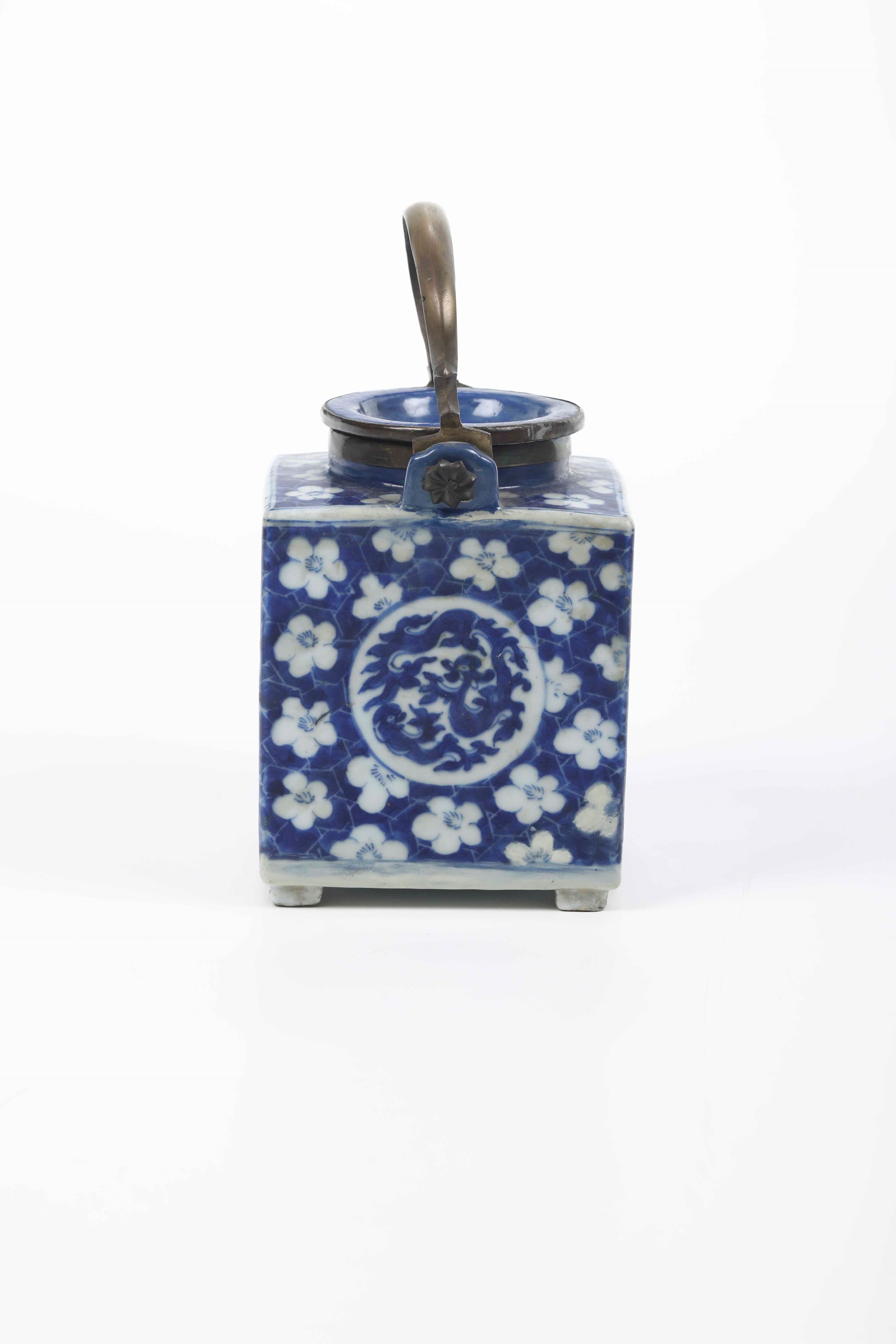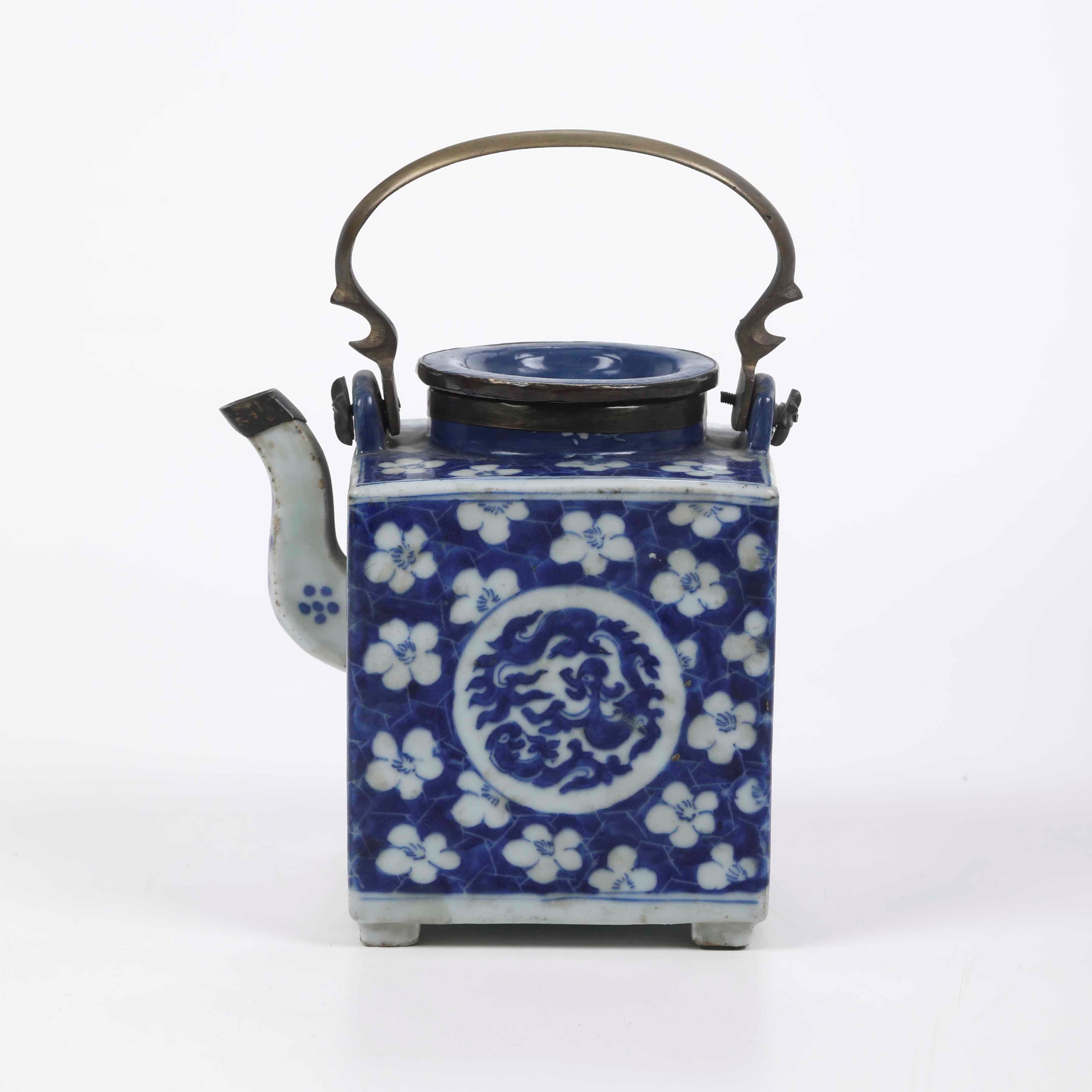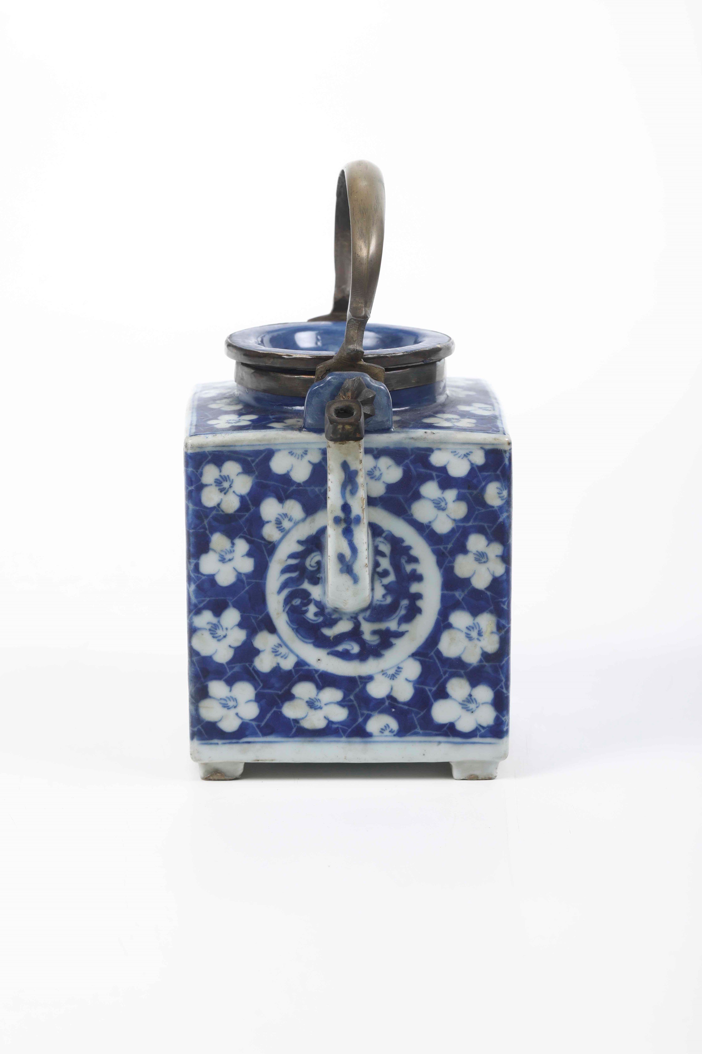 Teiera in porcellana bianca e blu con decori floreali e figure di draghi entro riserve, [..]