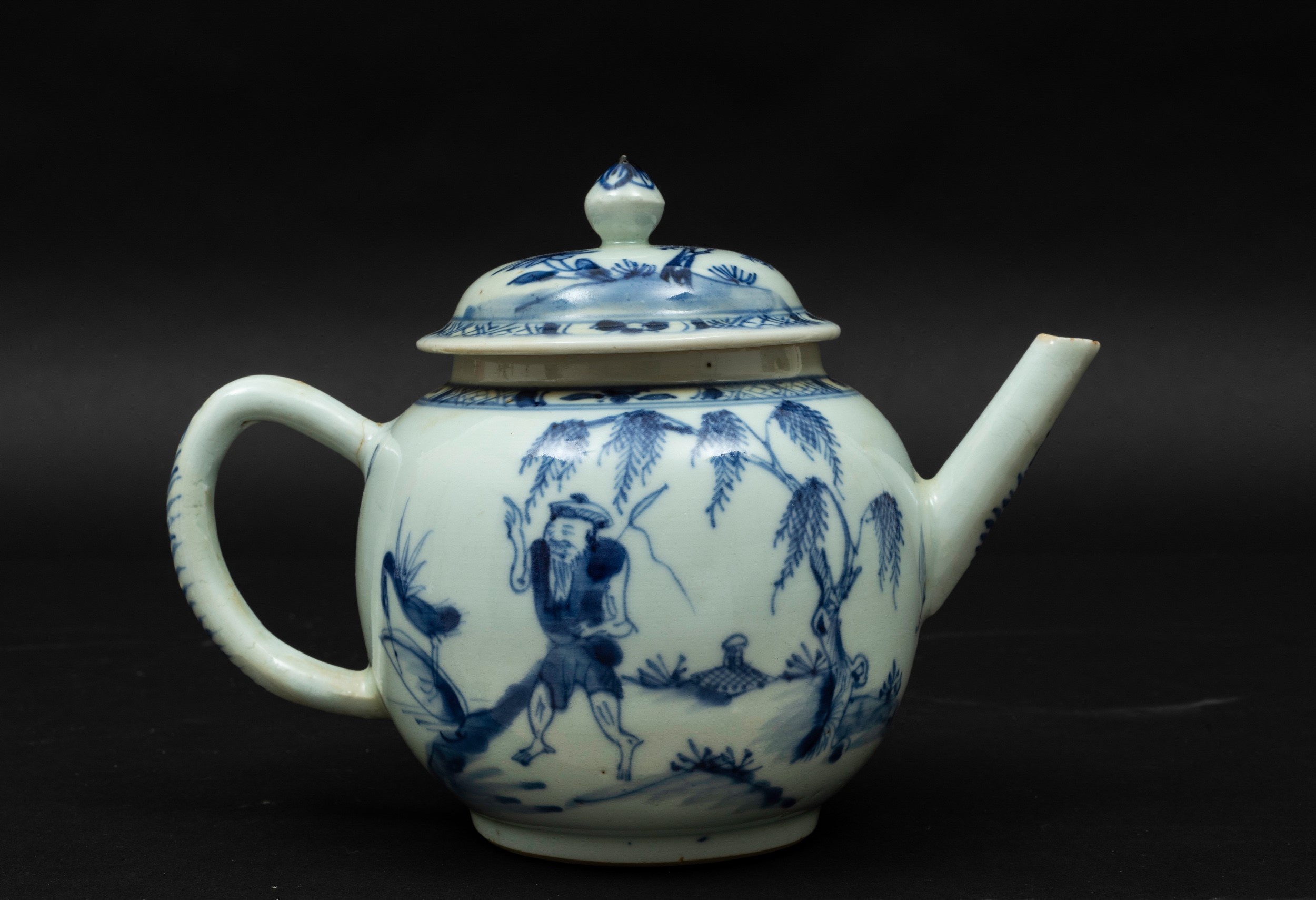 Teiera in porcellana bianca e blu con personaggio entro paesaggio, Cina, Dinastia [..]