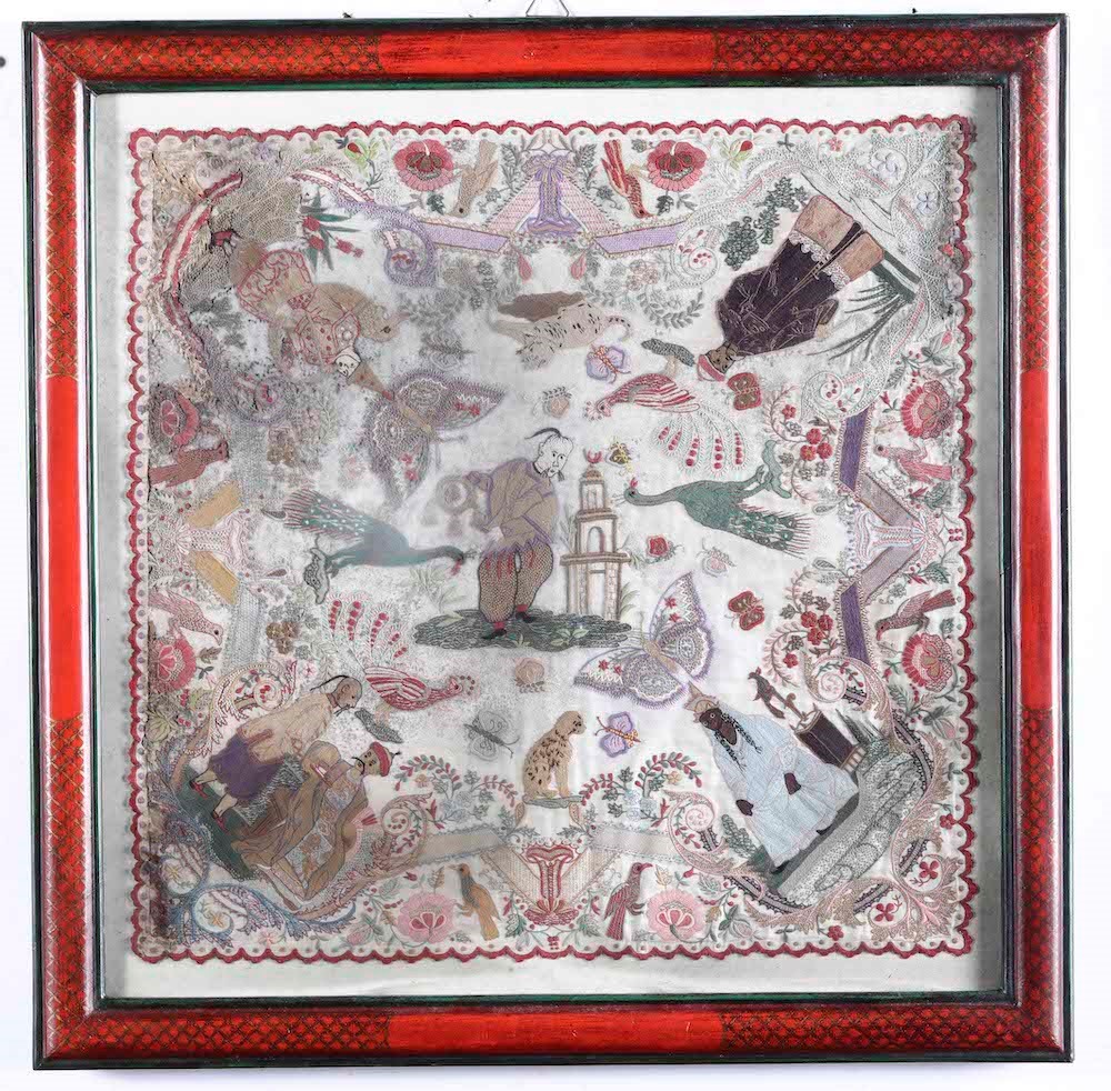 Tessuto in seta ricamata con personaggi e animali su fondo bianco, Cina, Dinastia [..]