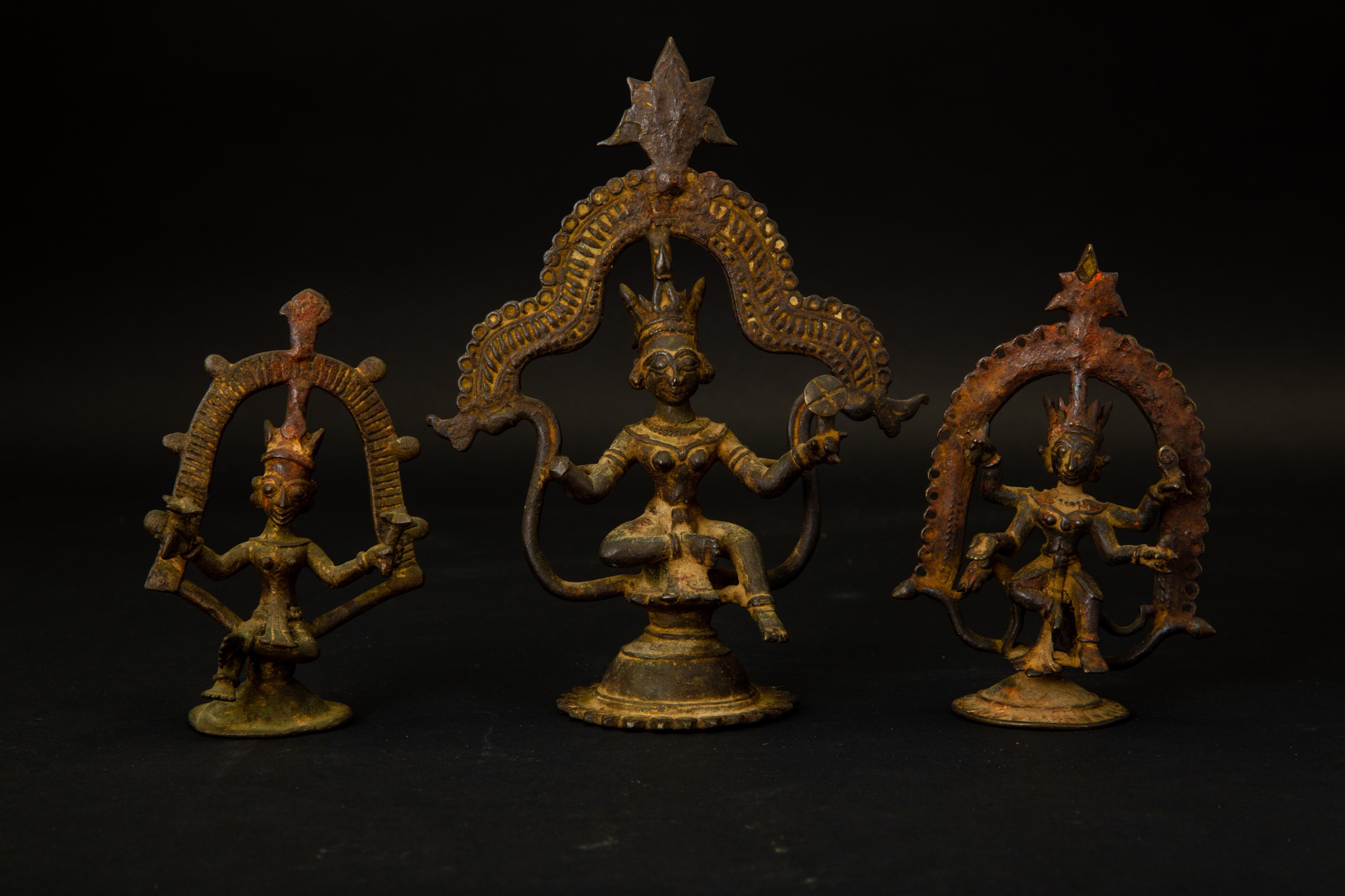 Tre figure in bronzo di divintà assise su piedistalli circolari e sovrastate da [..]