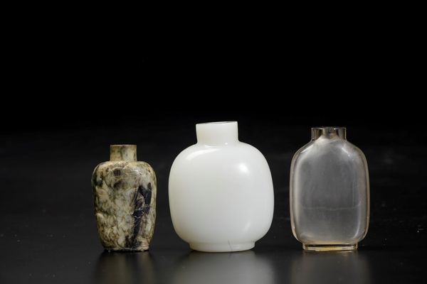 Tre snuff bottles scolpite in cristallo di rocca e saponaria, Cina, Dinastia Qing, [..]