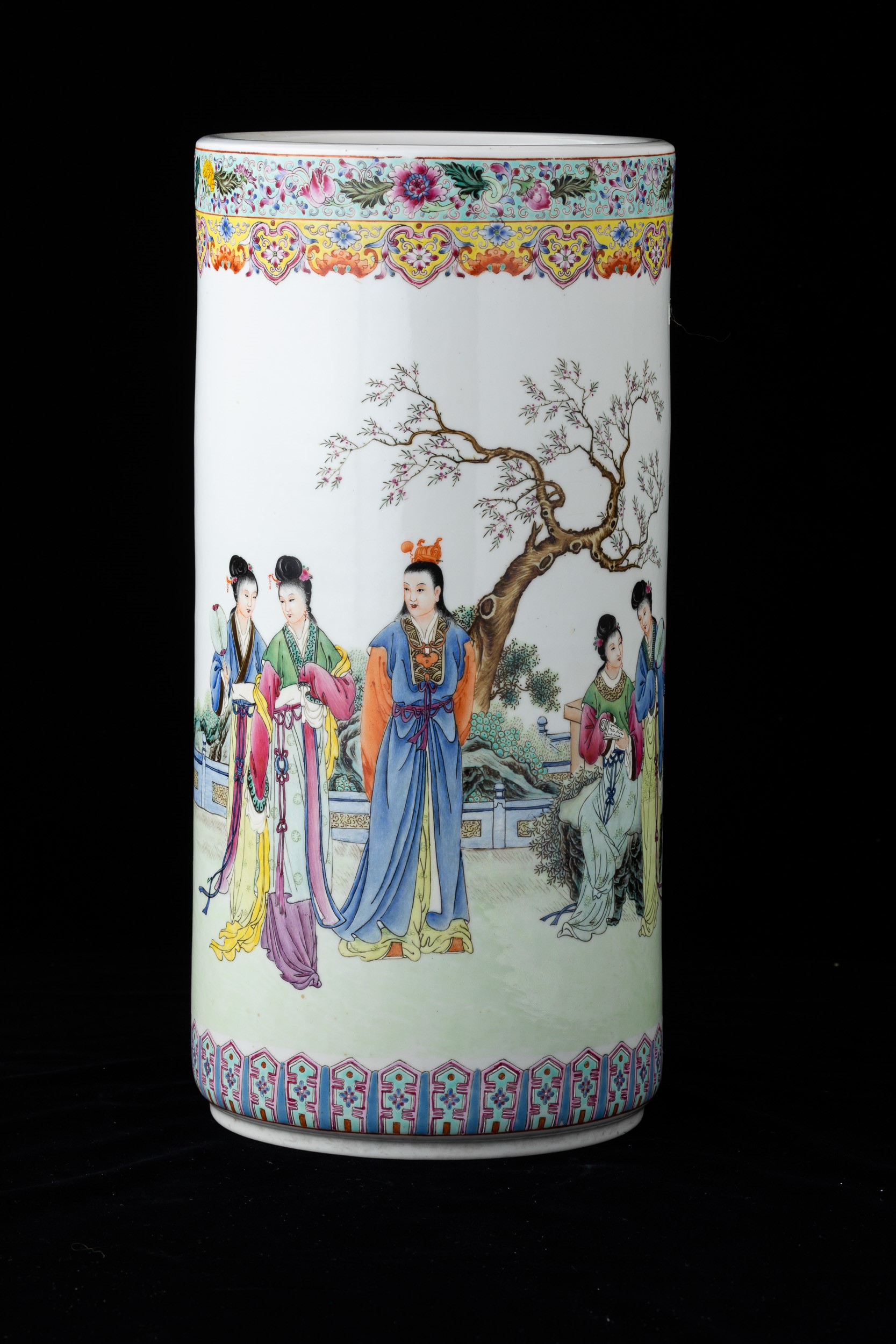 Vaso cilindrico in porcellana sui toni della Famiglia Rosa raffigurante cortigiane [..]