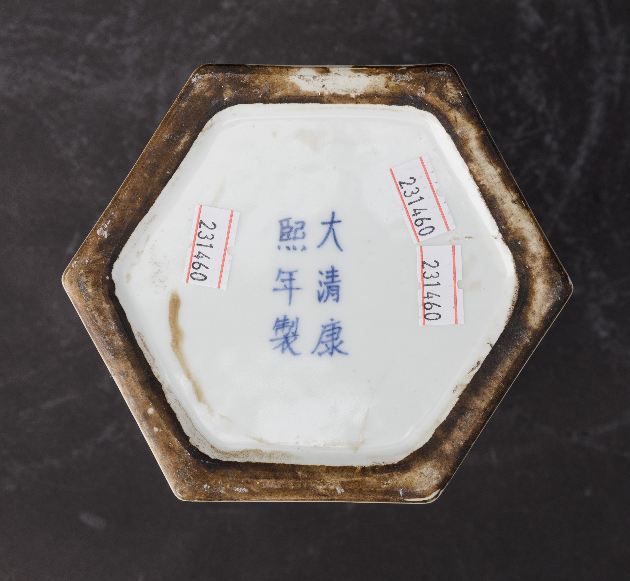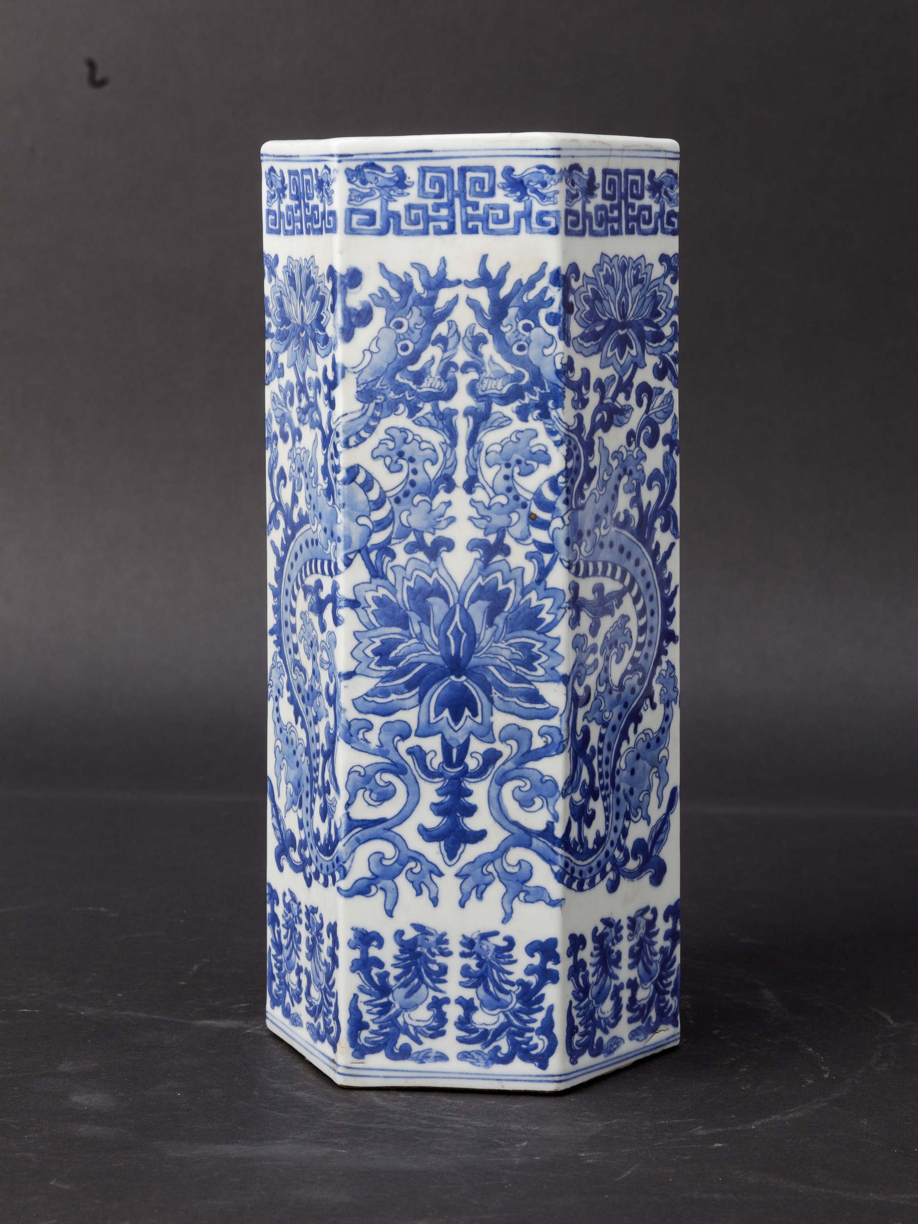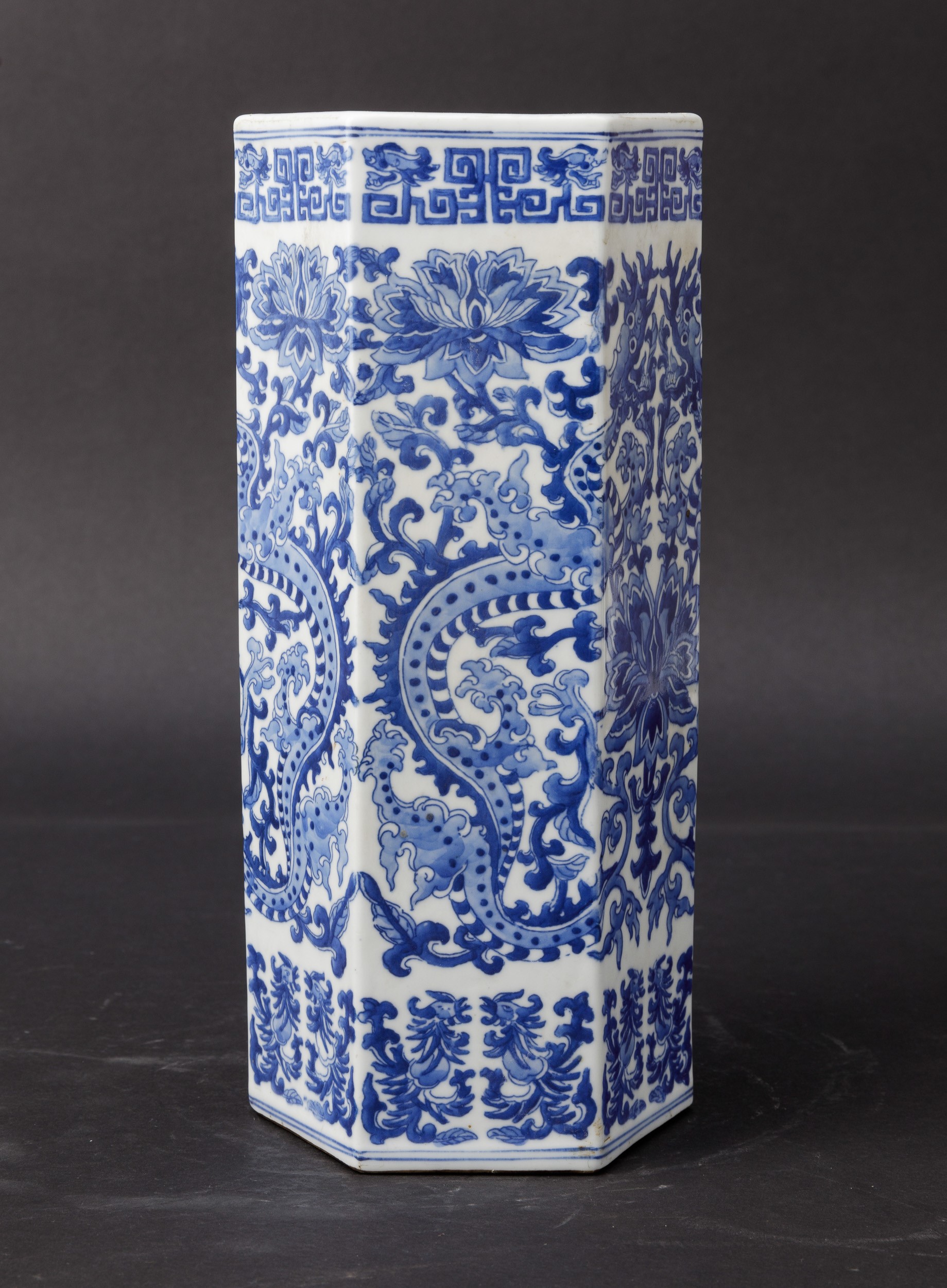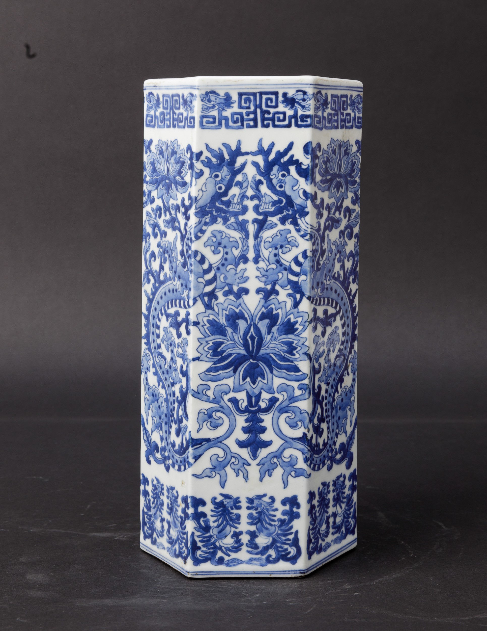 Vaso in porcellana bianca e blu a sezione esagonale figure di fenici, draghi e decori [..]