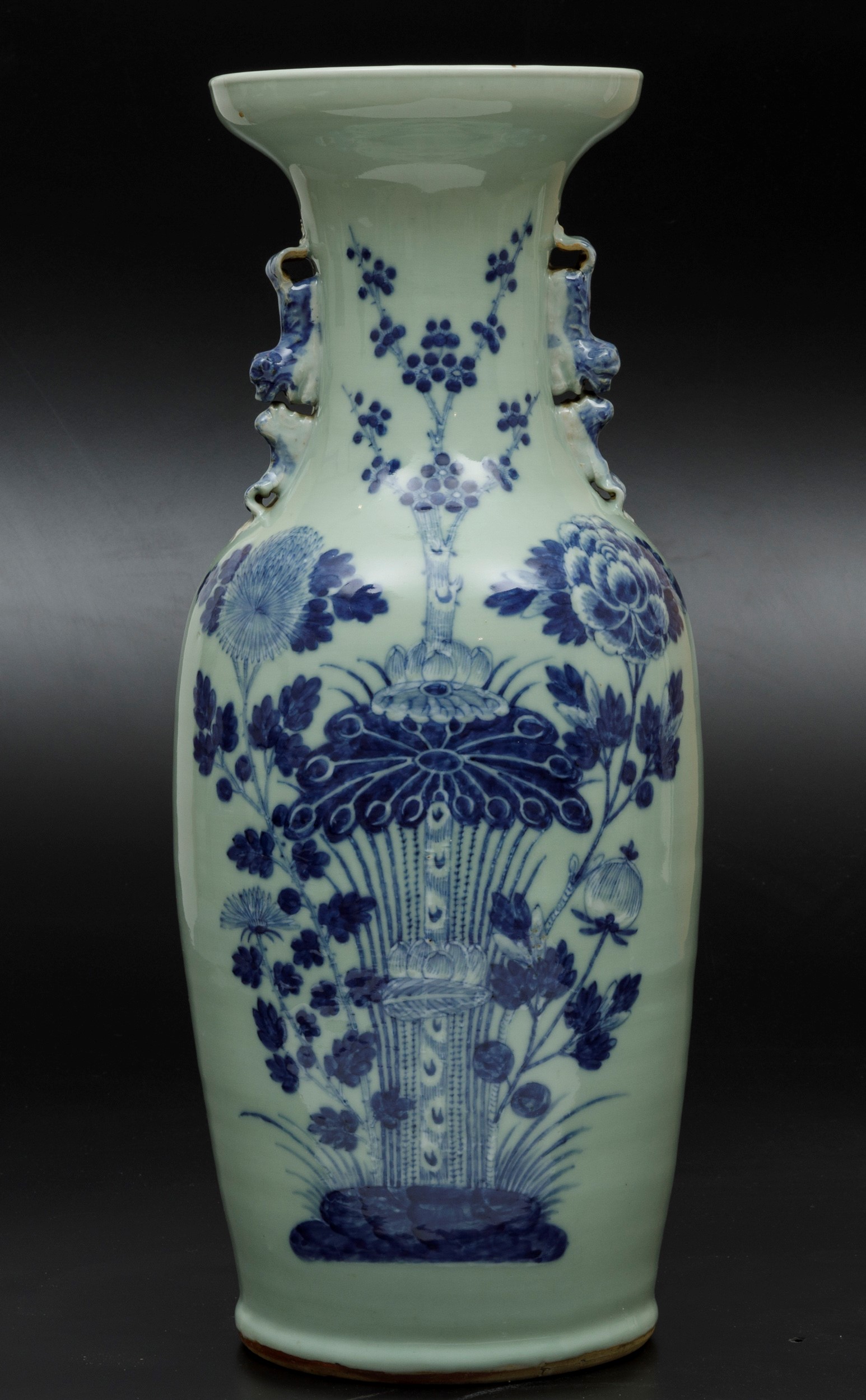 Vaso in porcellana bianca e blu con decoro floreale su fondo Celadon e figure di [..]