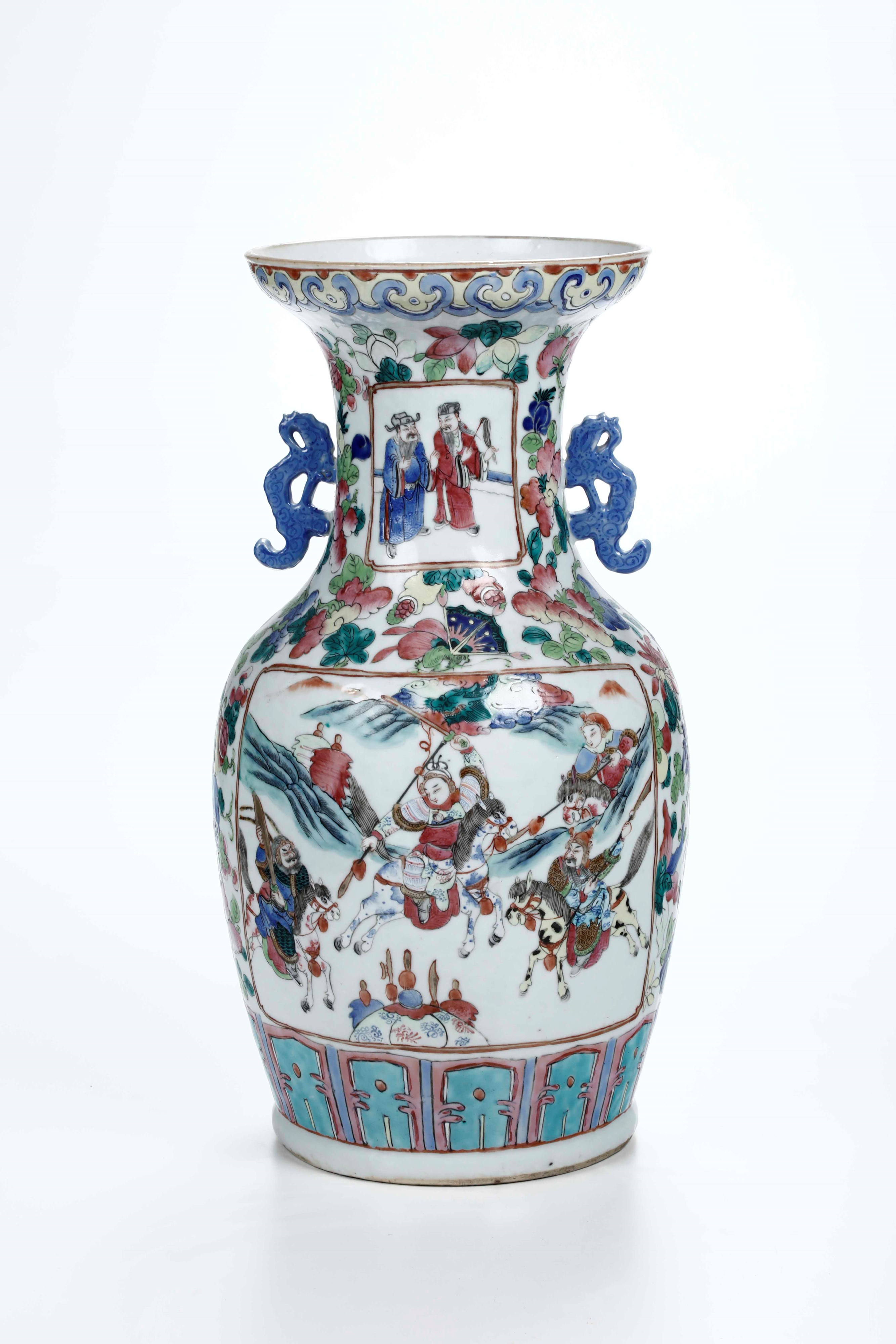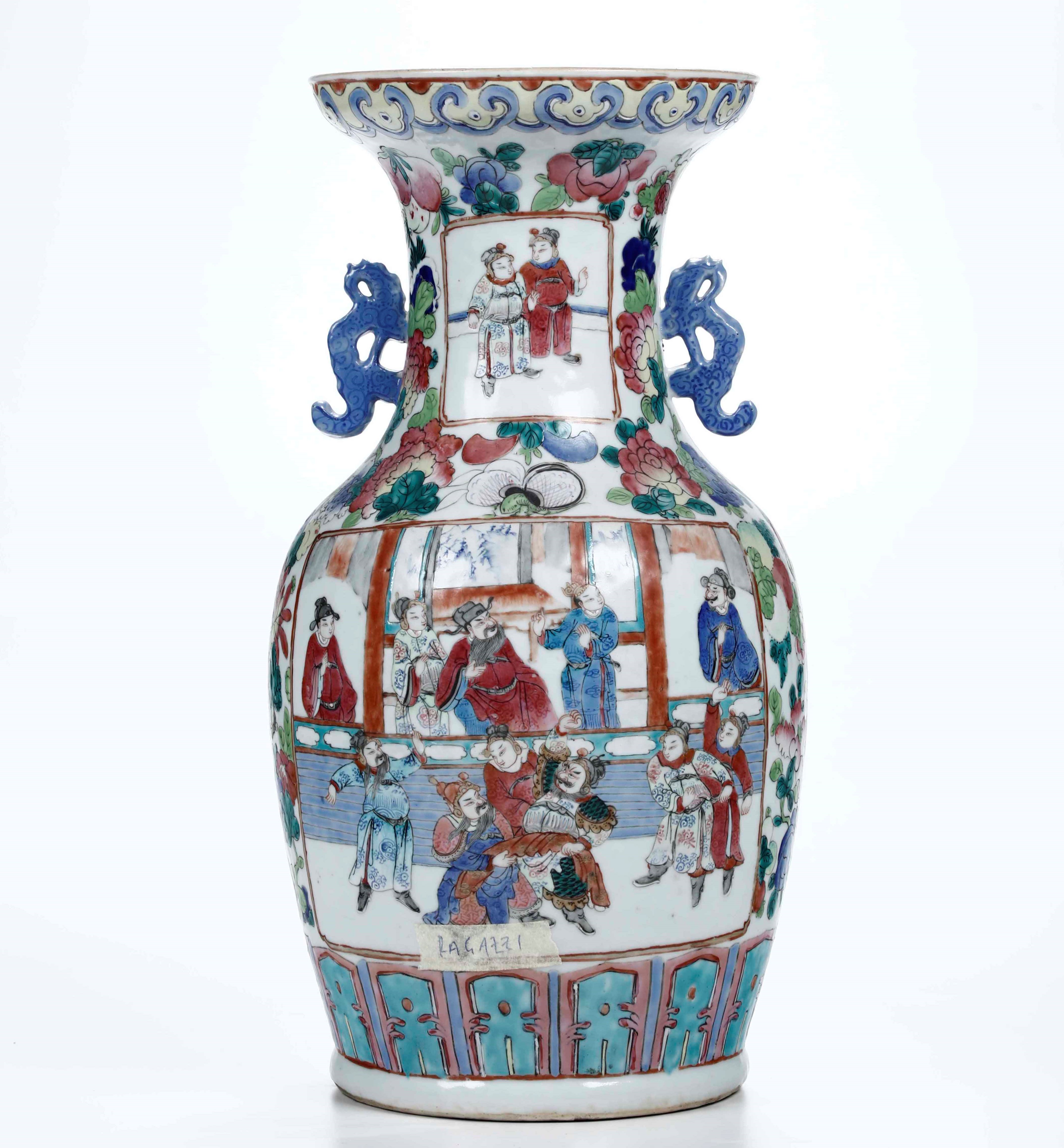 Vaso in porcellana con anse sagomate e scene di vita di corte entro riserve, Cina, [..]
