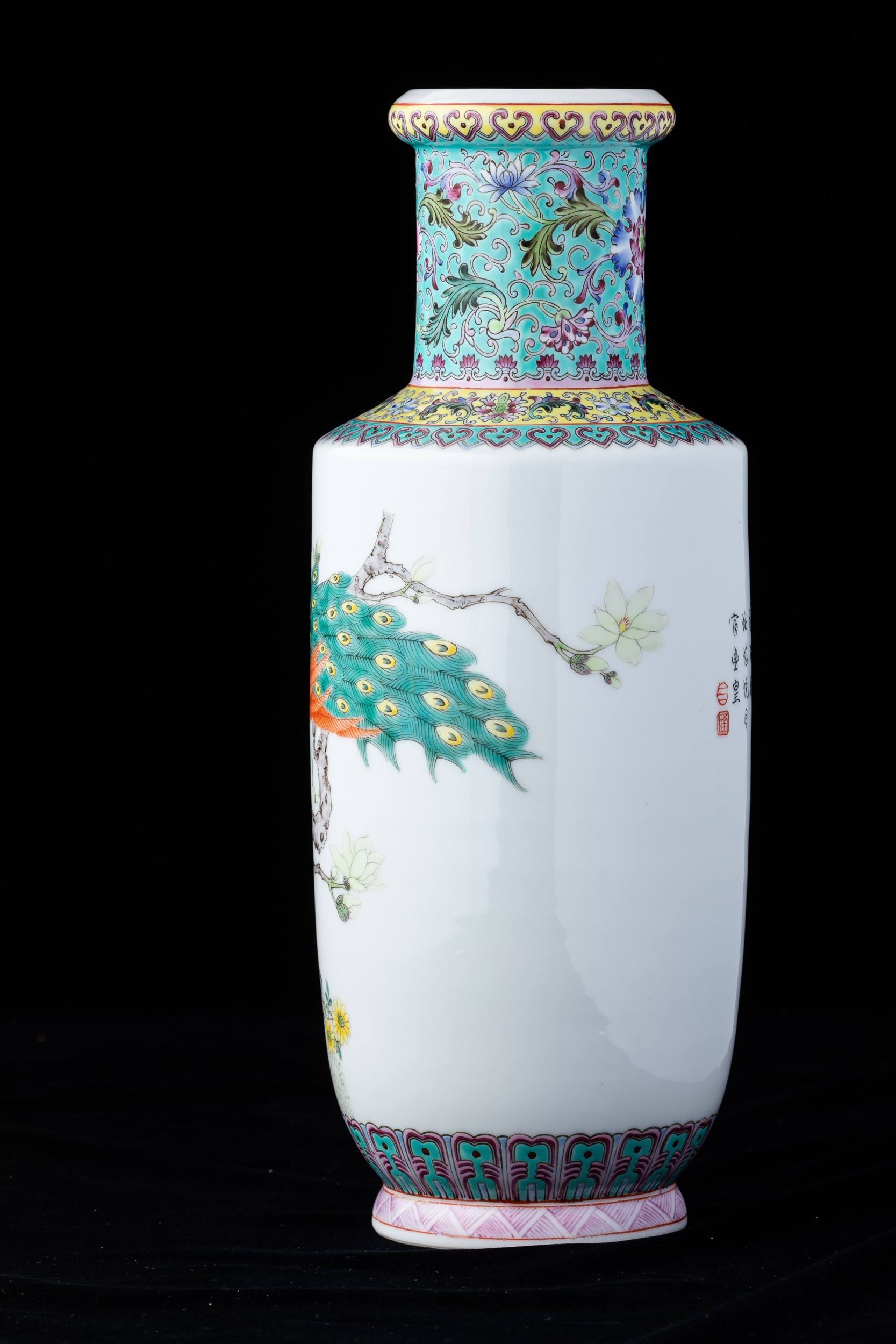 Vaso in porcellana con figura di pavone, decori floreali e iscrizioni, Cina, Repubblica, [..]
