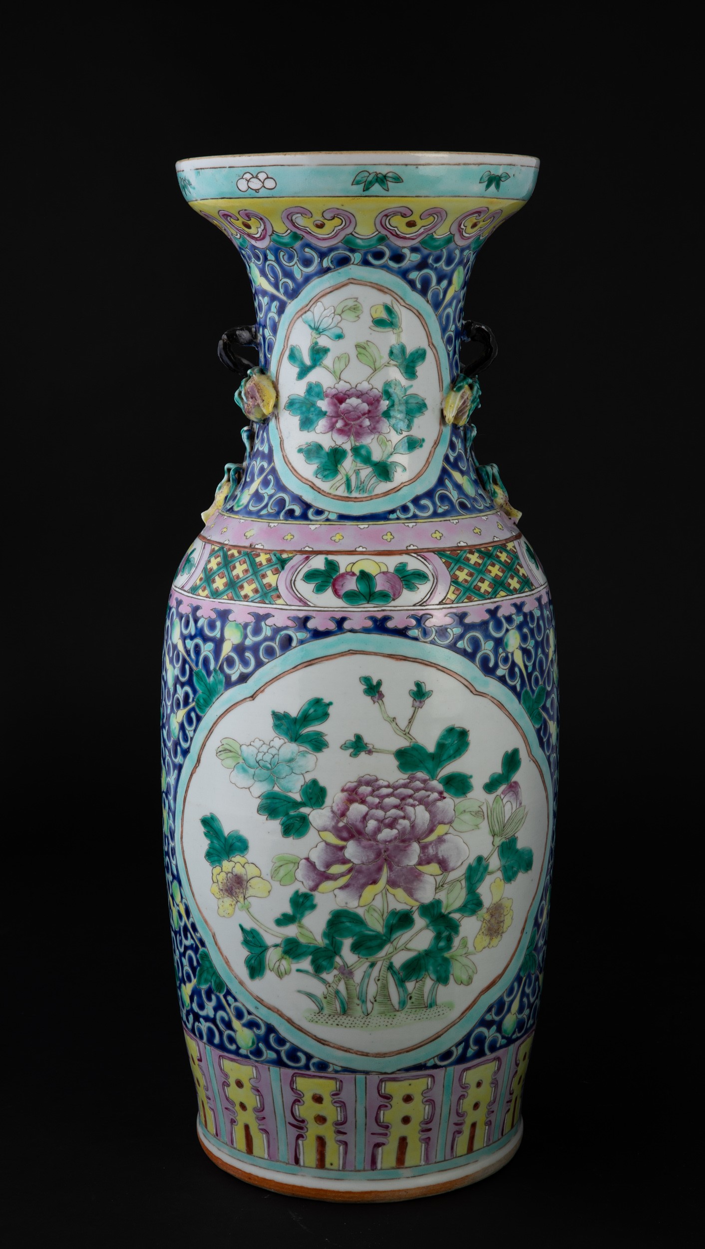 Vaso in porcellana con soggetti naturalistici entro riserve, decori floreali su [..]