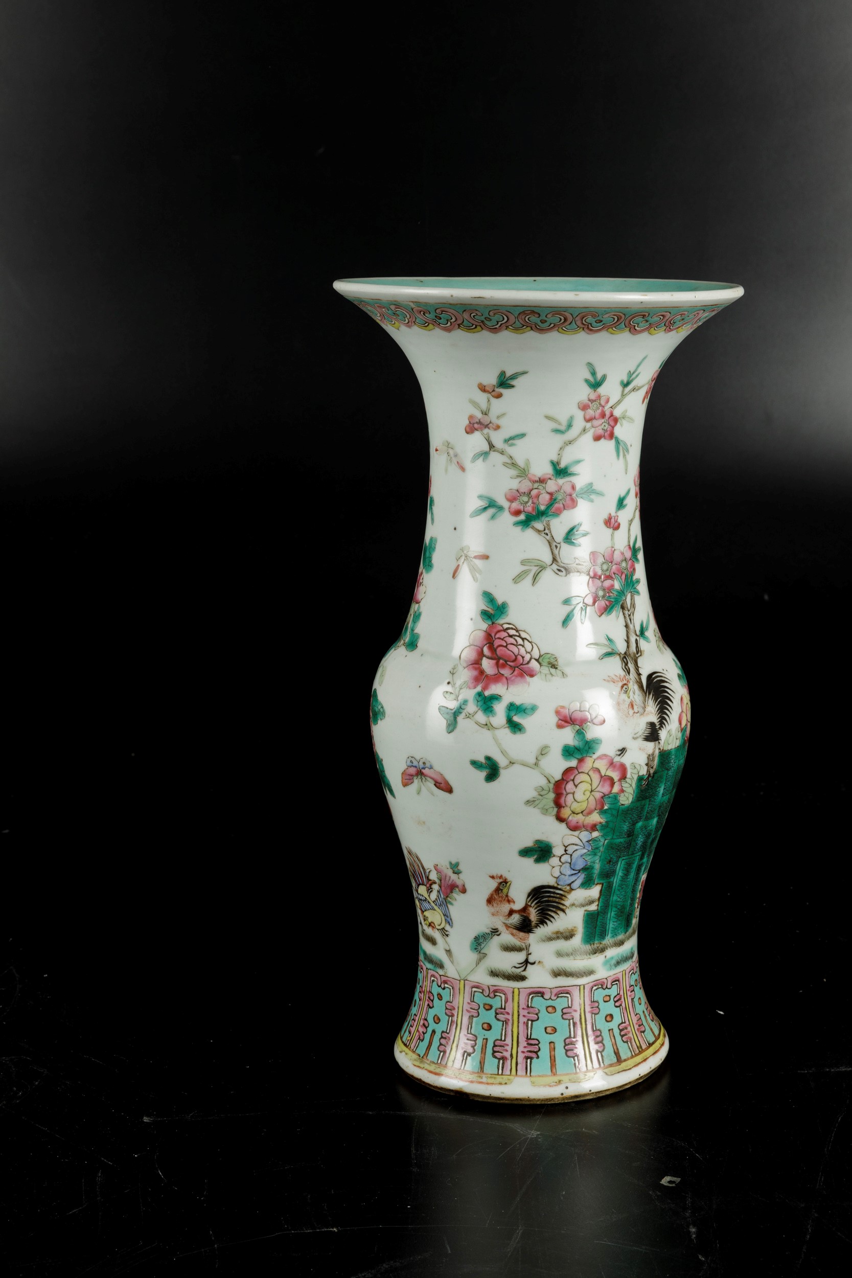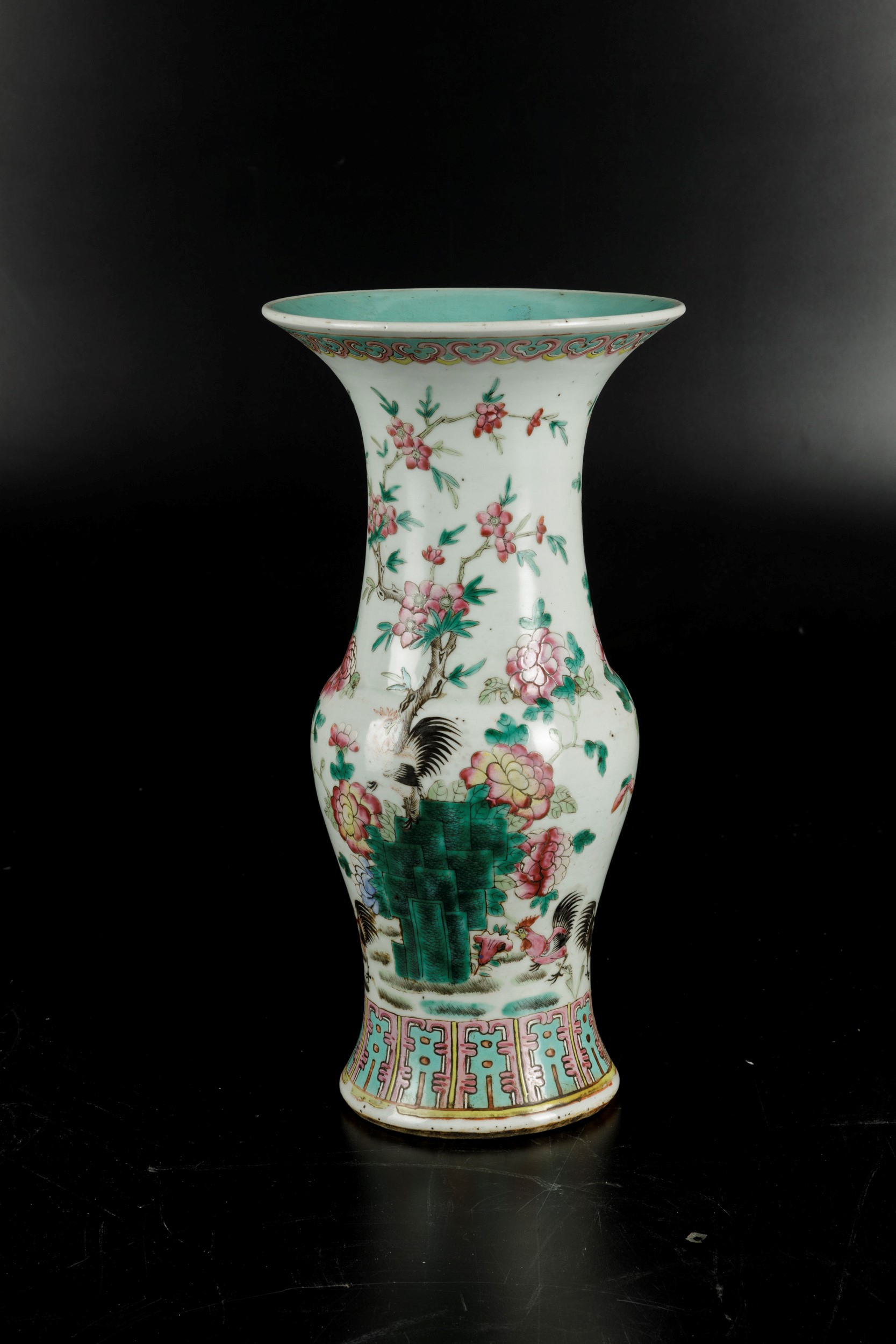 Vaso in porcellana sui toni della Famiglia Rosa raffigurante galli entro paesaggio [..]
