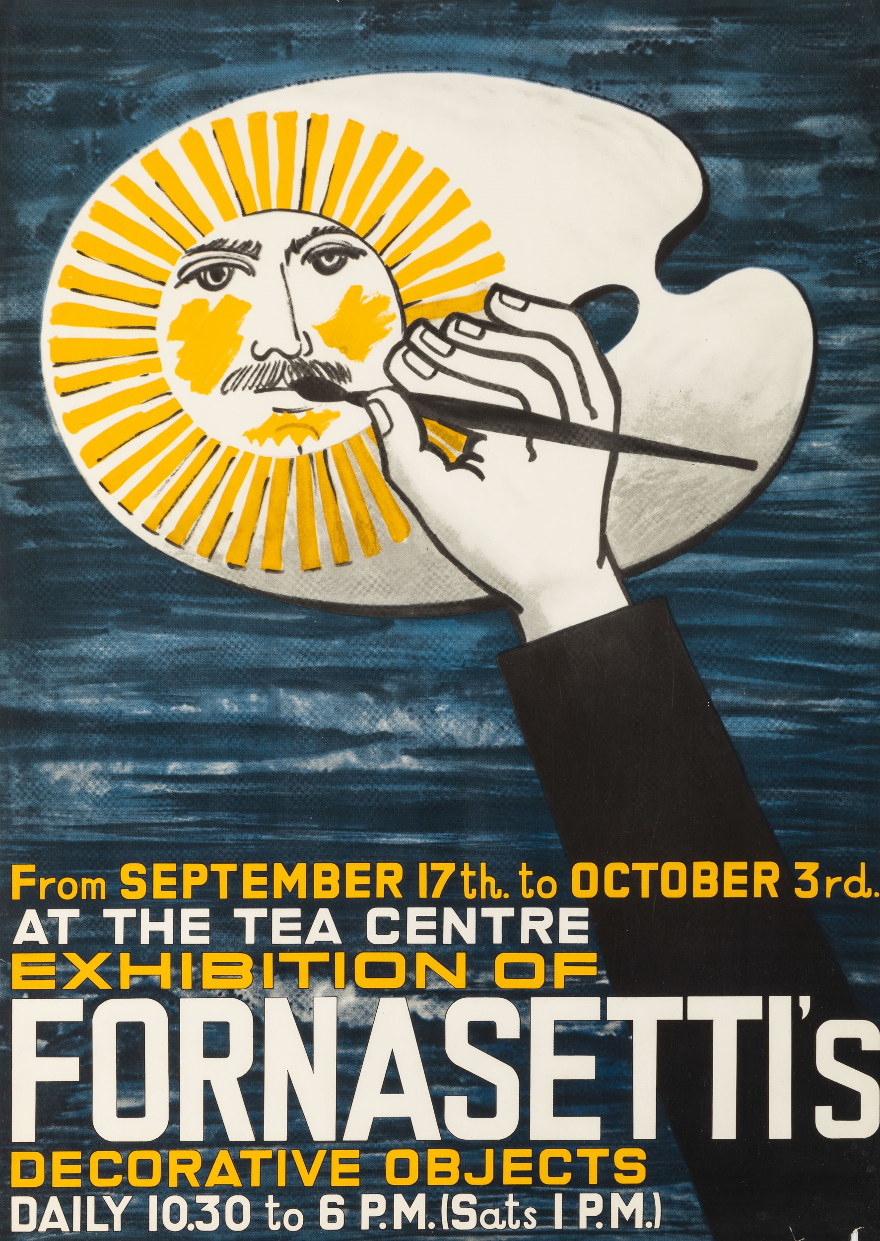 1958 Poster per Esposizione di Oggetti Decorativi Fornasetti al Tea Centre, Londra 17 Settembre - 3 Ottobre 1958.