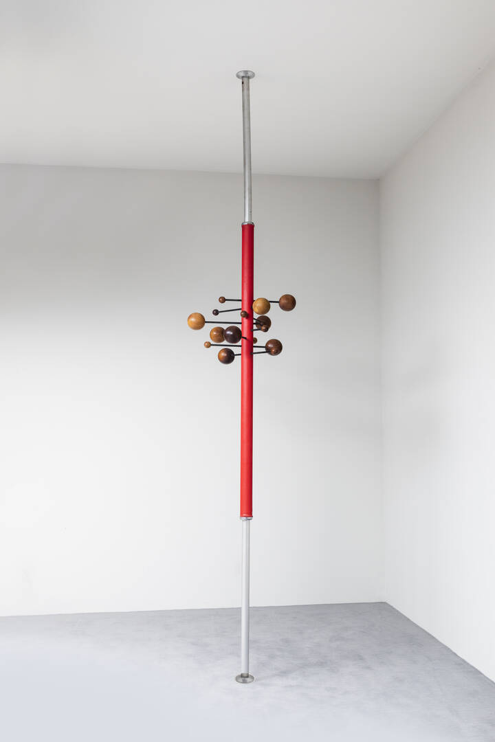 Appendiabiti a colonna in metallo verniciato pelle e legni diversi. Prod. Tecno dal 1954 h cm 250 - 320 Bibl.: Giampiero Bosoni Tecno. L'eleganza discreta della tecnica Skira 2011 pag. 108 - 109