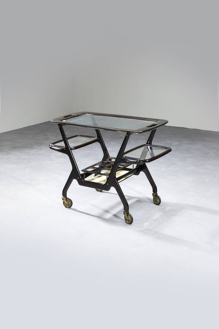 Carrello in legno di mogano piani in vetro. Anni '50 cm 68x82x50