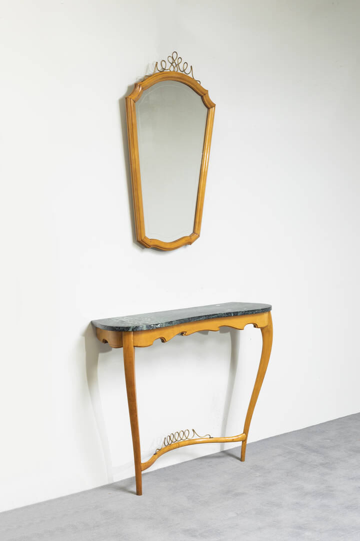 Console con specchiera in legno chiaro particolari in ottone piano in marmo verde Alpi. Anni '50 console cm 83x95x32 specchio cn 95x55