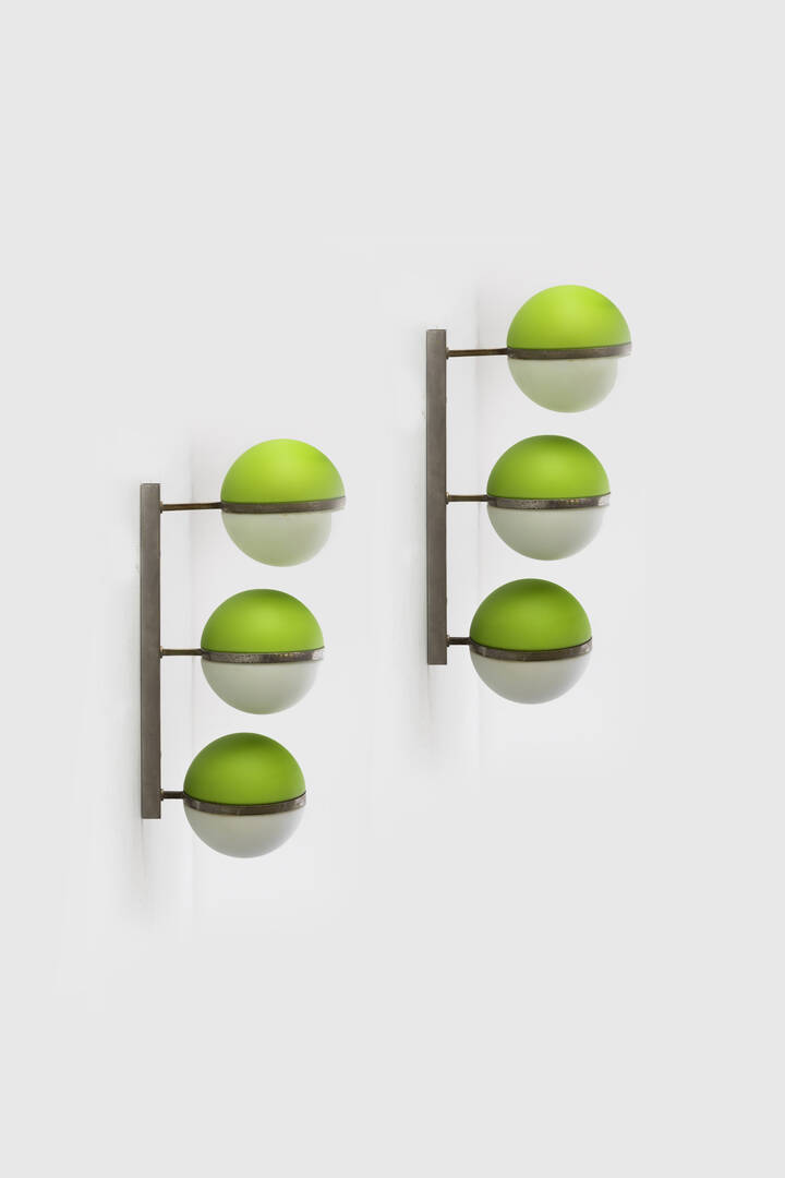 Coppia di appliques in acciaio con diffusori in vetro colorato e vetro satinato. [..]