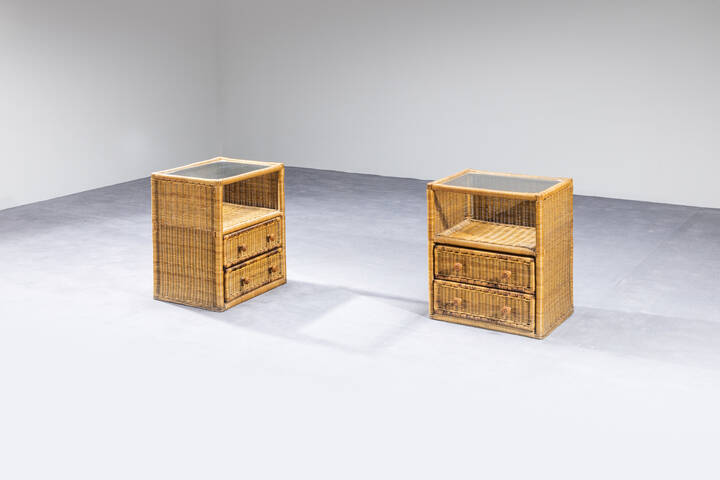 Coppia di comodini in bamboo piano in vetro. Anni '70 cm 60x51x40