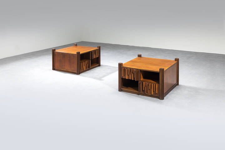 Coppia di comodini/mobiletti in legno con antine scolpite. Anni '60 cm 45x72x72