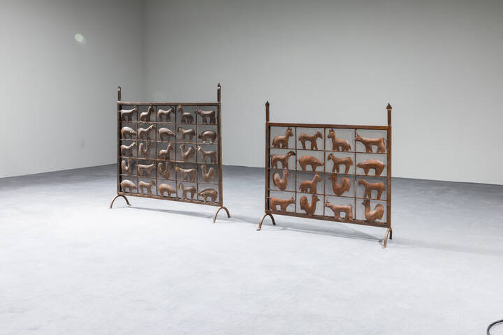 Coppia di parascintille in ferro battuto con decorazioni di figure animali stilizzate. Anni '60 rispettivamente cm 90x91 e 78x76