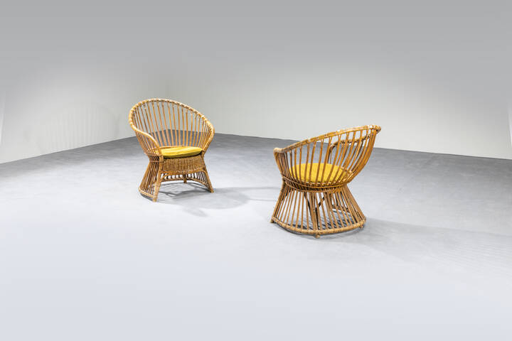 Coppia di poltroncine in vimini cuscini imbottiti rivestiti in tessuto. Anni '50 [..]