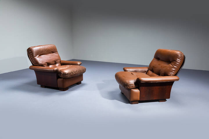Coppia di poltrone con scocca in legno curvato cuscini imbottiti rivestiti in pelle. [..]