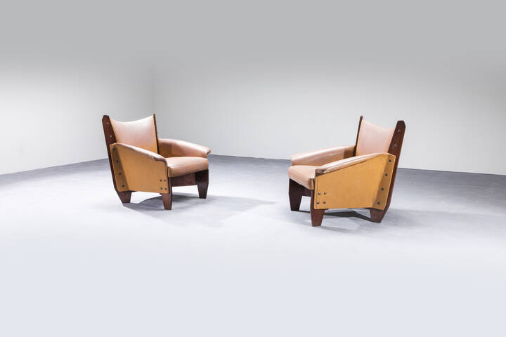 Coppia di poltrone con struttura in compensato curvato cuscini imbottiti rivestiti [..]