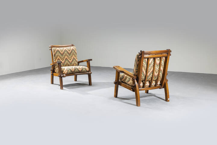 Coppia di poltrone con struttura in legno cuscini imbottiti rivestiti in tessuto. [..]