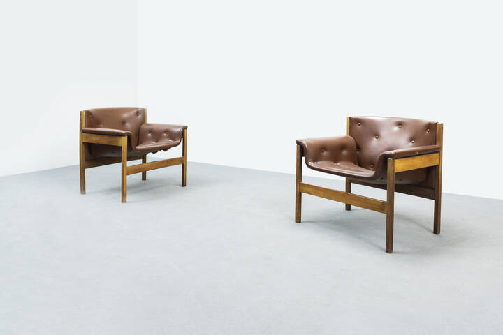 Coppia di poltrone con struttura in legno sedute e schienali imbottiti rivestiti in cuoio. Anni '50 Prod. La linea 1957 cm 80x70x70 Bibl.: Giuliana Gramigna Repertorio del Design Italiano1950-2000 Allemandi 2011 pag. 52