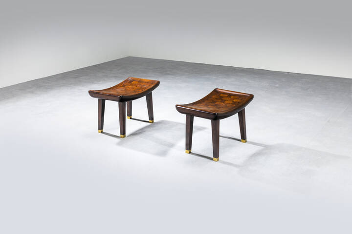 Coppia di sgabelli in legno di varie essenze terminali in ottone. Anni '50 cm 3 [..]