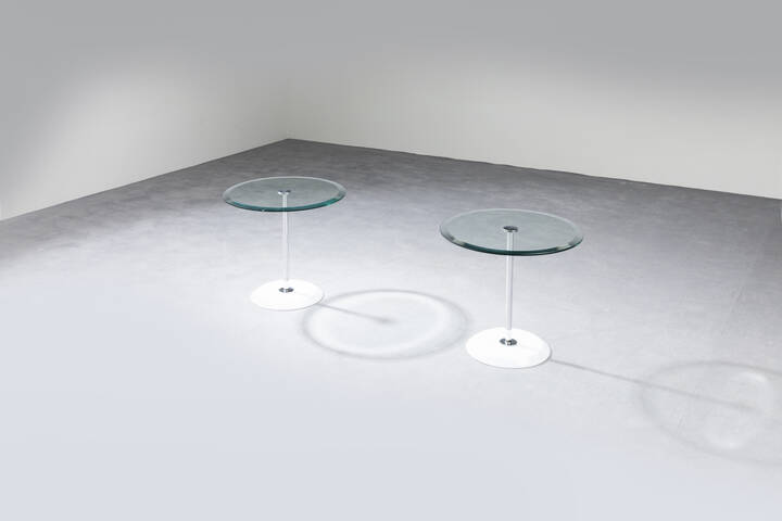 Coppia di tavolini con base in marmo bianco di Carrara stelo in metallo cromato e piani in vetro molato. Anni '70 cm 51x56