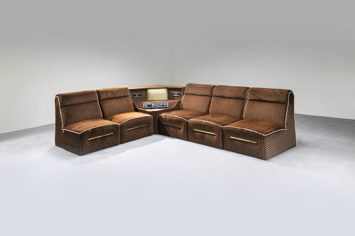 Divano con imbottitura rivetita in tessuto elemento angolare con radio annessa. Anni '60 cm