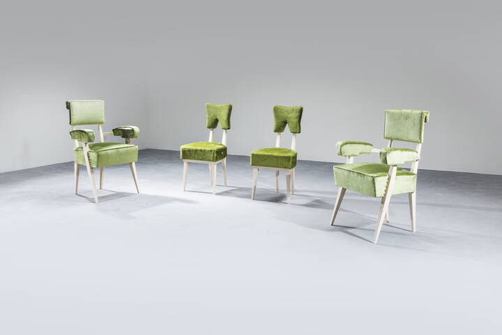 Due sedie e due poltrone con struttura in legno laccato imbottitura rivestita in [..]
