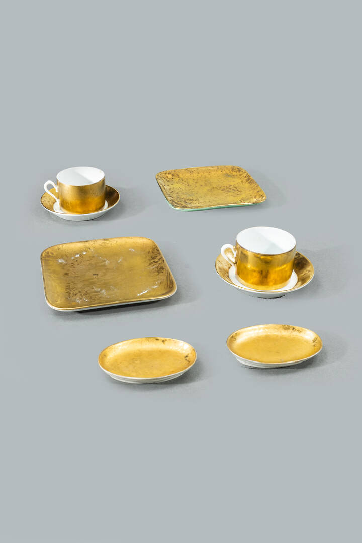 Ceramica con applicazione in oro zecchino. Marcato sotto la base Anni '60 cm 17x17 11x7 e 5 5x8 Bibl.: B. Fornasetti ( a cura di) Fornasetti. La bottega fantastica Electa 2009 pag. 605